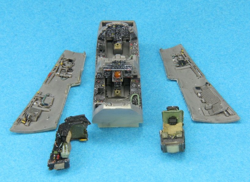 Pour ce qui est du cockpit j’ai opté pour la première fois sur un de mes Phantom pour un set résine : il s’agit en réalité d’un set Aires conçu pour un F-4F Revell. Même s’il n’est pas strictement identique, l’air de famille est fort entre le cockpit du F-4F et le RF-4E. C’est donc très ressemblant, le kit Aires est fouillé et détaillé, une mise en peinture attentive fera illusion, bien plus que les décalques proposées par Hasegawa ou même des sets de photodécoupe. Autre avantage, le cockpit du F-4F Revell étant légèrement sous dimensionné, le cockpit entre sans trop de difficultés dans la maquette Hasegawa.