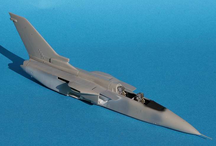 Les parties détaillées du poste de pilotage sont intégrées sans aucune difficulté dans la pointe avant dont les pièces sont collées. Le fuselage arrière est ensuite assemblé. La grande dérive du Tornado est montée de son coté.