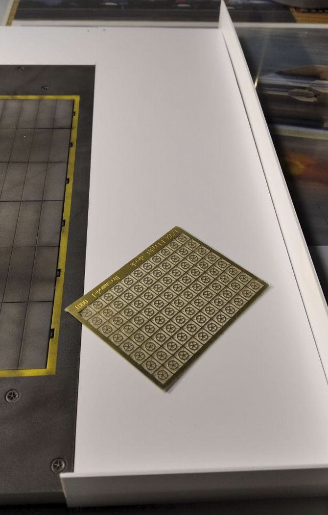 A noter que ces points d'arrimage (ici à 5 branches) sont gravés en relief dans la base Italeri, ils ne permettent donc pas de passer les crochets des chaînes d'arrimage des appareils et du matériel. Pour une telle possibilité il faudrait les remplacer par les "étoiles" en photodécoupe proposées par certaines marques (Infinity, dreammodel, l'arsenal...)