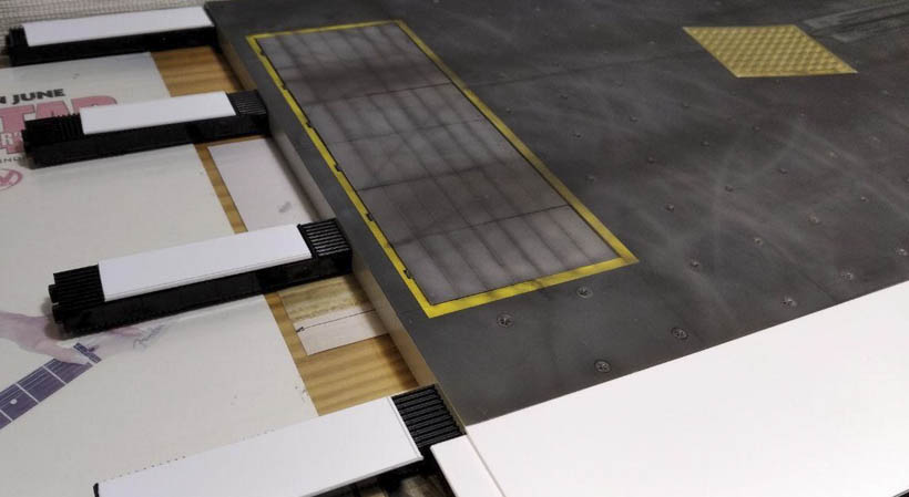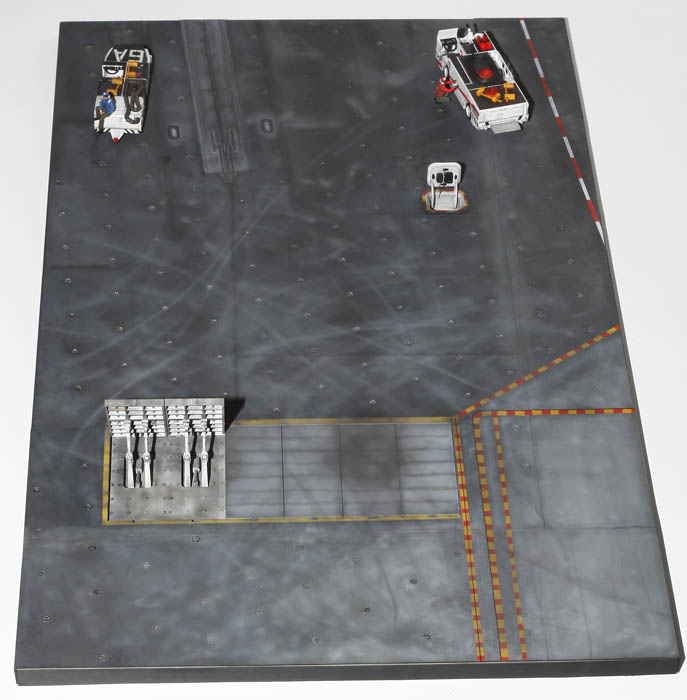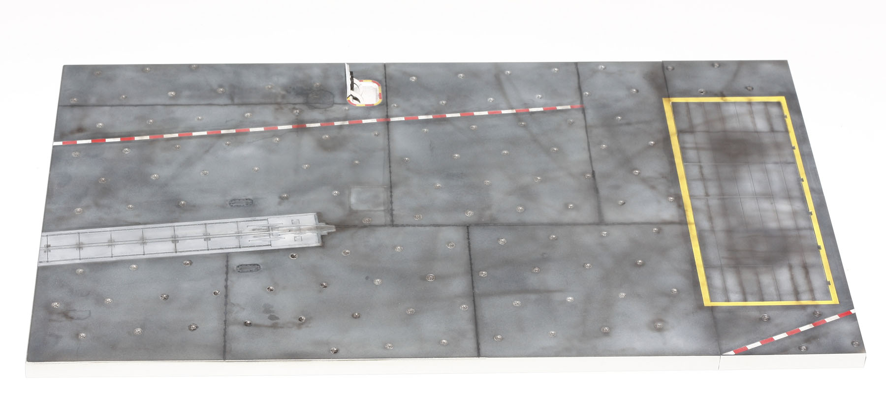 Comme je n'envisage pas spécialement de représenter un jet prêt à être lancé, j'ai souhaité agrandir cette base Italeri pour plus de liberté de disposition des futurs avions. Cela m'offrira également plus d'angles de prises de vues au moment des photos finish des modèles.