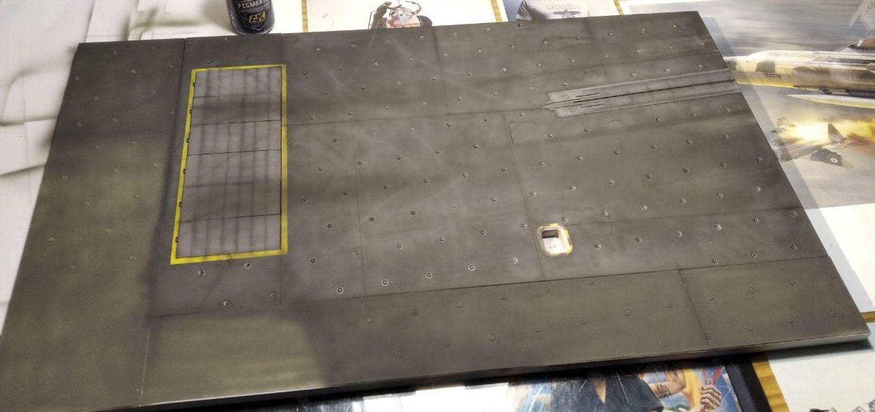 - L'ensemble du pont est ensuite sali avec un pinceau sec à l'aide des pigments AK "Burnt Jet Engine".