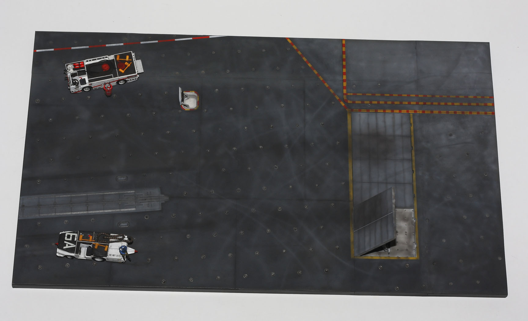 3. La couleur de l'enrobé du pont varie énormément selon le porte-avion, selon les dates de réfection du pont etc. L'enrobé peut aller du gris clair au noir sur la totalité du pont, ou certaines zones seulement etc. Idem pour la couleur des points d'arrimage des avions : Soit leur couleur ressort vraiment, avec une teinte metal très claire voire blanche, soit ils se confondent presque à la couleur du pont.