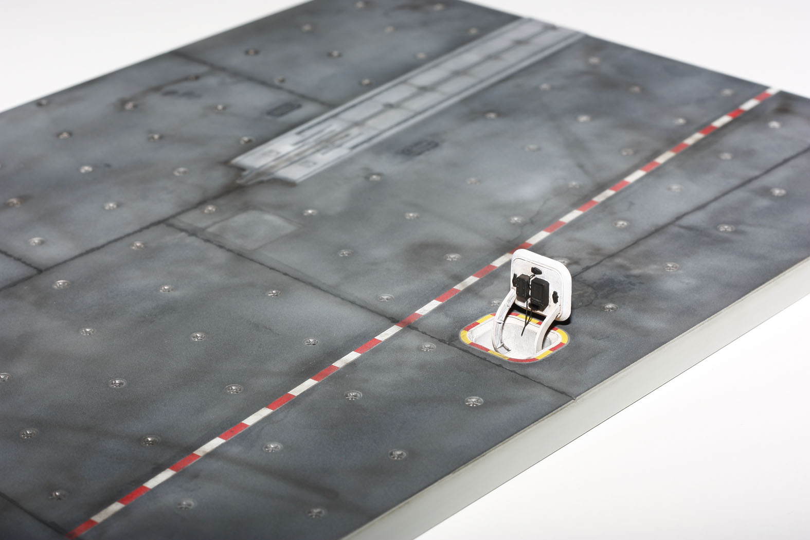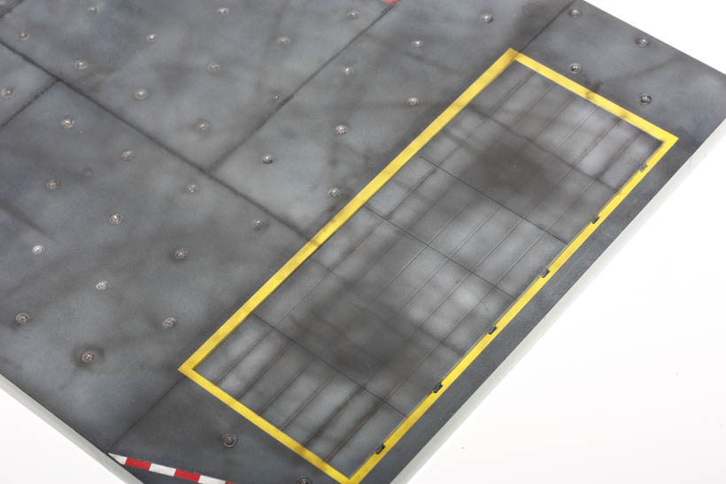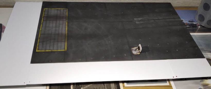 Remarque : En obstruant cette trappe, il semble possible de représenter avec la base Italeri la catapulte principale située sur la piste d'atterrissage du porte avion (catapulte n°3).