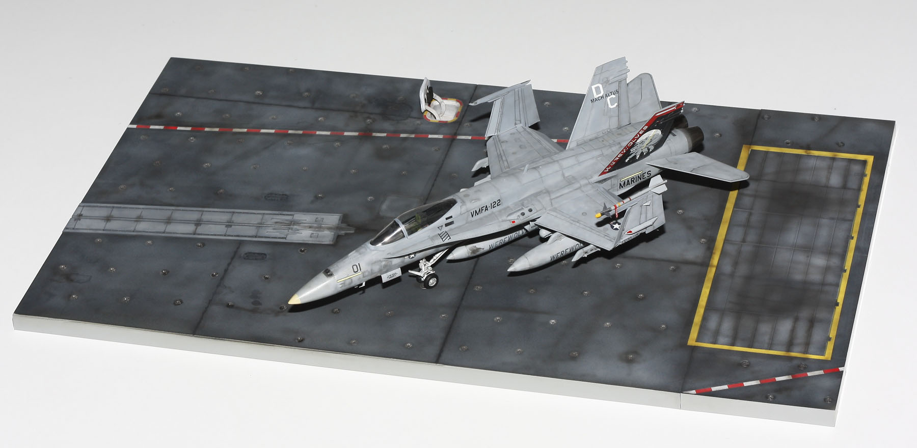 "Génération Top Gun" oblige...C'est un pont de l'US Navy que je souhaite représenter. La section de pont d'envol d'Italeri présentée ici m'apparaît la base la plus pratique car disponible aujourd'hui, relativement peu onéreuse, en injecté, bien détaillée.