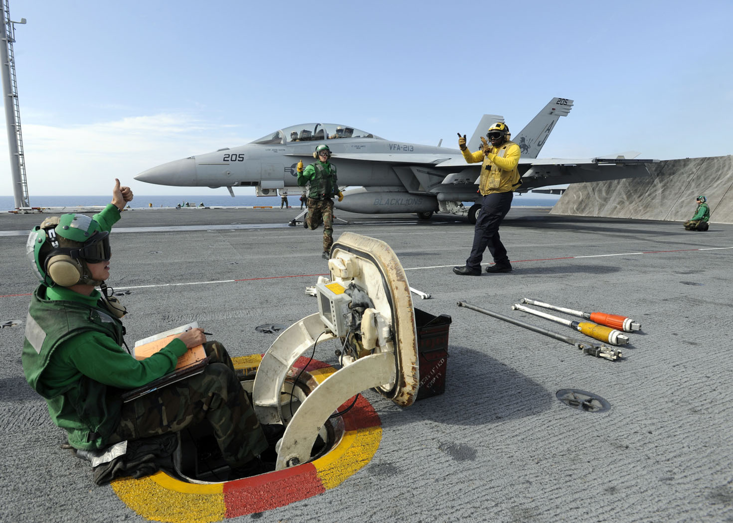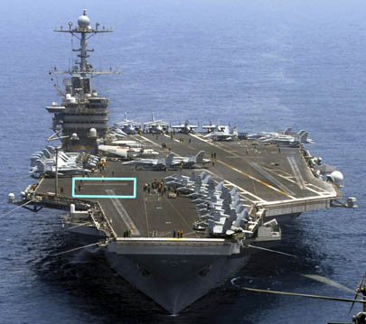 Une telle trappe est forcément située plus loin sur le pont, au delà de l'aéronef prêt à être lancé :