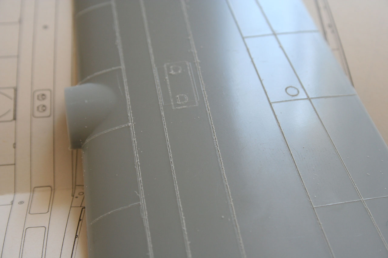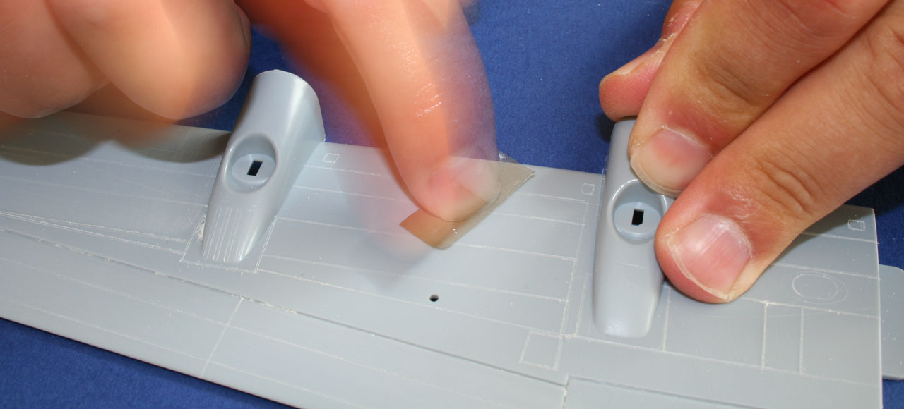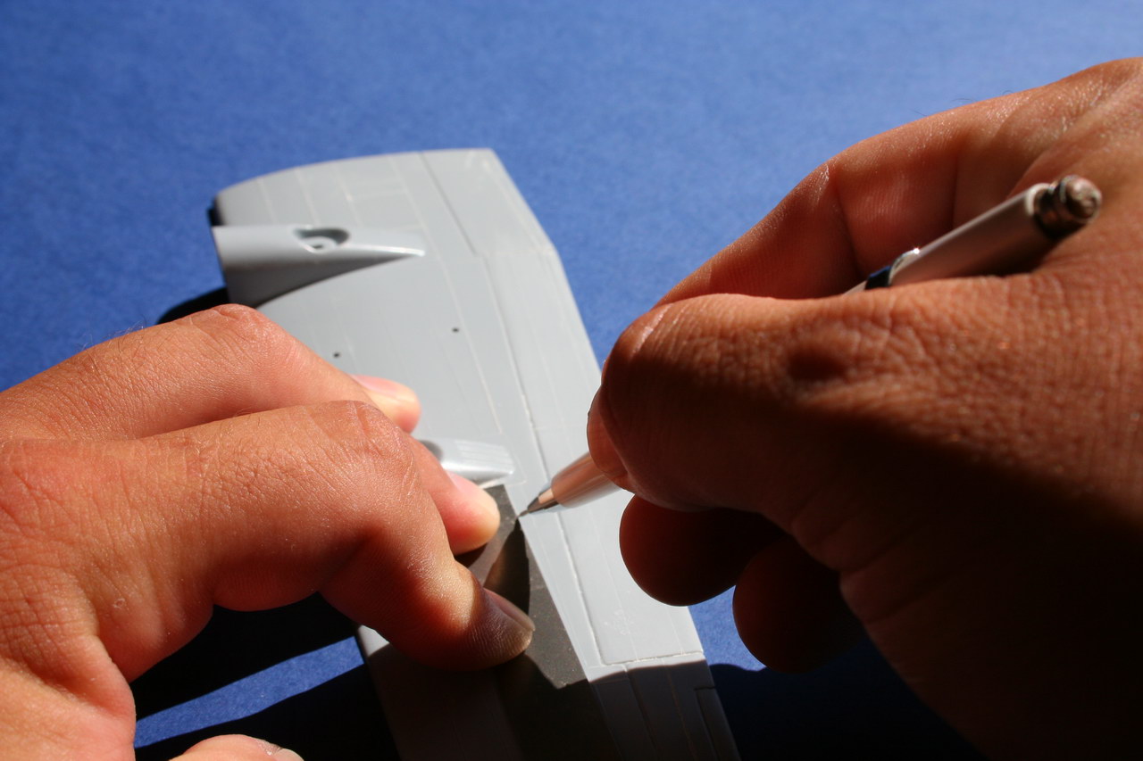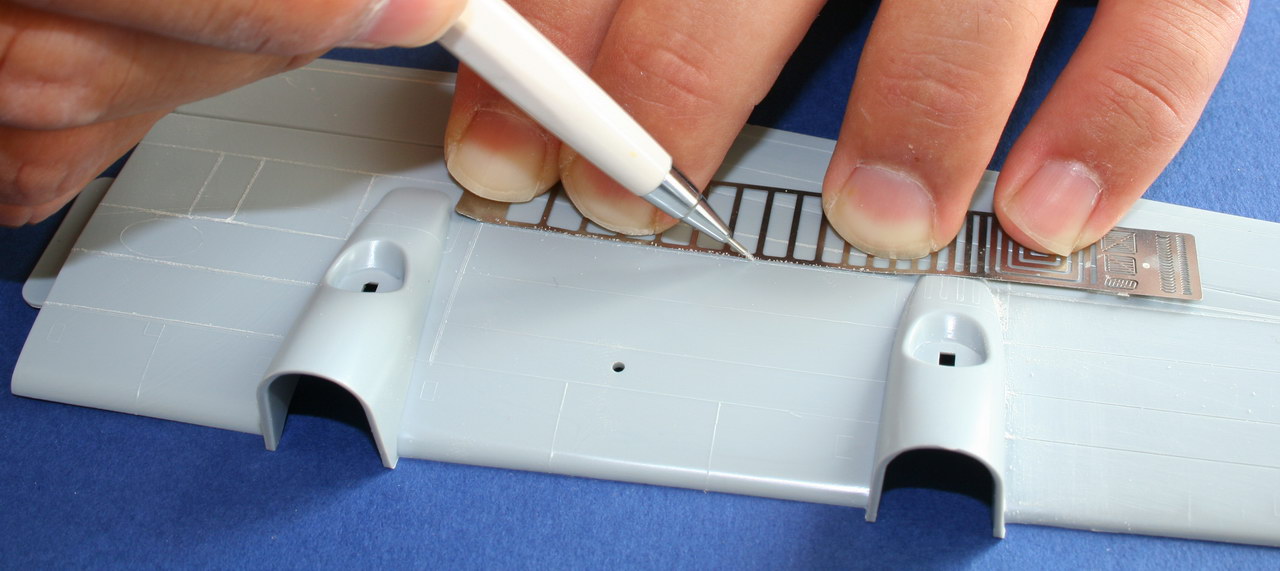 Les ailes assez plates sont les parties les plus faciles à regraver, le fuselage arrondi, les nacelles moteurs demandent plus de précautions pour la regarvure, pour graver les parties arrondie la bande Dymo autocolante découpé en fines bandellettes est alors ulitilsée. Il faut bien prendre son temps bien placer le reglet ou la bande Dymo avant de regraver avec la pointe. Toutes instabilités conduira inévitablement à l'erreur de gravure. |