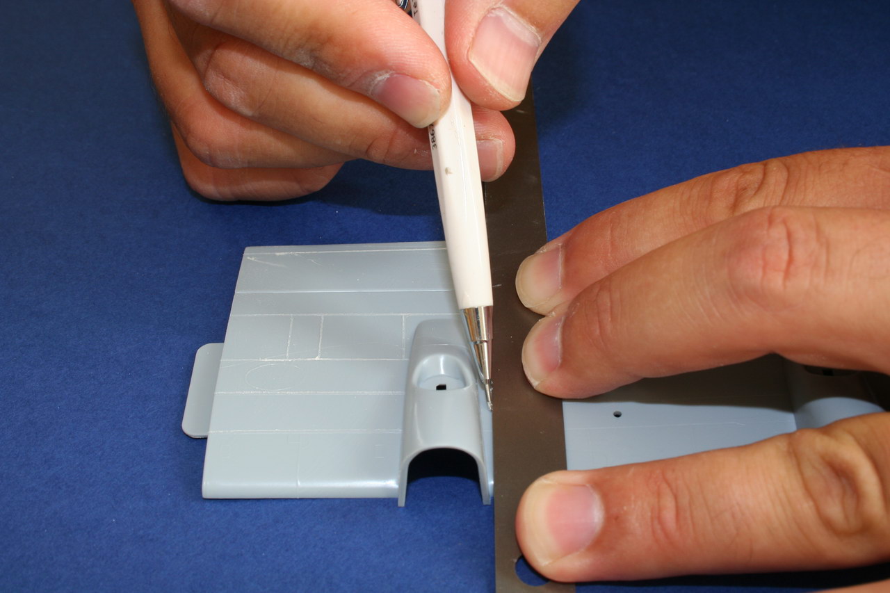 Pour regraver la maquette j'utilise les outils suivants : un reglet metalique, de la bande Dymo, des guides Verlinden, et l'outil à graver :une pointe d'épingle placée dans un porte mine. Après avoir essayé plusieurs outils spécifique pour la regravure : pointe à graver Squadron, Tamiya...) une simple épingle dans un porte mine me parait être la meilleur solution, enfin c'est avec cette métode que j'ai obtenu les meilleurs résultats