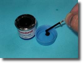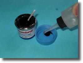 2 - Dans un petit recipient preparez le jus en déposant de la peinture humbrol de la teinte de votre choix pour la patine. Déposez donc quelques gouttes de peinture noire dans un bouchon de bouteille par exemple puis diluez fortement la peinture avec du White Spirit. Le jus obtenu doit etre très liquide.