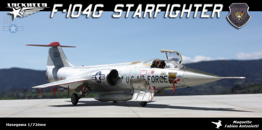 Lockheed F104G starfighter, 4510th CCTW, Luke Air Force Base, USA Construit par Lockheed, n° de série 63-13251 A partir de 1964, le programme de formation de la Luftwaffe conduit les pilotes Allemands en Arizona sur la base de Luke. Une centaine de Starfighters acquis par la RFA arborèrent les couleurs de l’USAF. Cette unité répartie en plusieurs Combat Crew Training Wing (CCTW) était composée d’une centaine de F-104G et TF-104. Ici la maquette Hasegawa, équipée d’un SUU21 « practice bomb dispenser ».