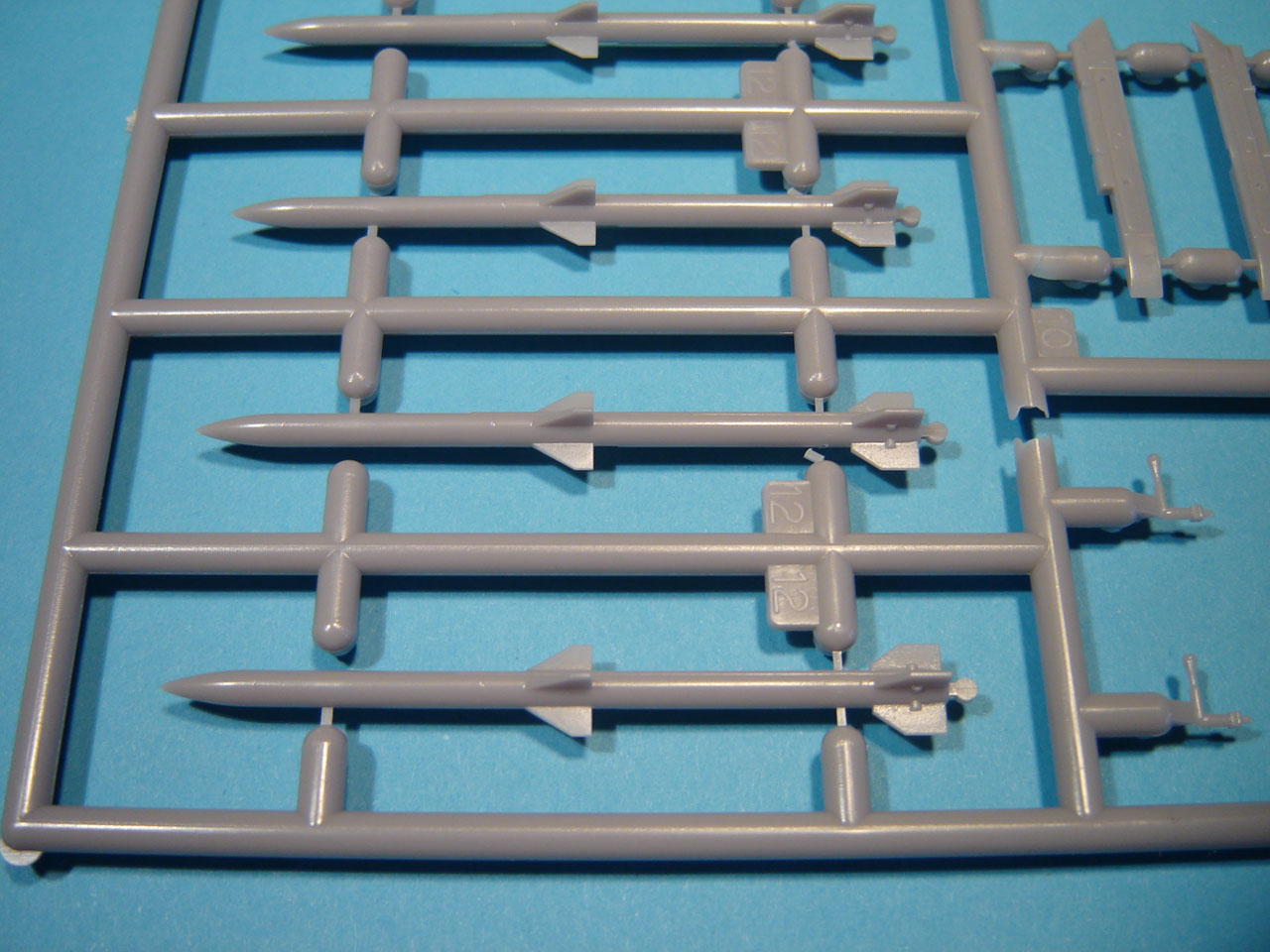 Voici une brève présentation en image de la nouvelle grappe. La qualité est au rendez vous : pièces bien nettes, fine gravure en creux, rivetage fin en creux. On appréciera des points d’éjection de la grappe très fins sur les missiles qui ne nécessiteront ni ponçage ni rebouchage, même si (comme d’ordinaire) les ailettes sont un peu épaisses pour l’échelle.