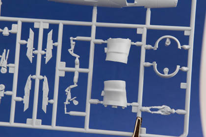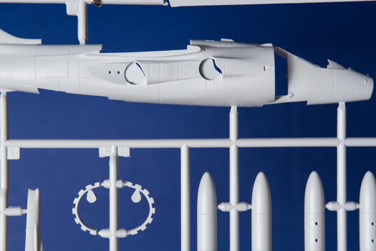 Certes, ce n'est pas encore le standard des maquettes Hasegawa, mais nous avons là des kits fort bien conçus. En ce qui concerne le Harrier GR1, objet de cette analyse, on peut remarquer la veine d'entrée d'air très bien représentée et cloisonnée jusqu'au fan du réacteur. Le logement de l’aérofrein est détaillé ainsi que le logement pourtant très petit du train d’atterrissage avant. L’empennage horizontal est prévu pour être incliné, entrées d'air avec trappes additionnelles baisées différemment, on peut donc sans aucun effort représenter fidèlement l'avion dans la configuration au sol, sur le tarmac. Les pneus sont moulés avec un léger écrasement, les pièces transparentes sont très fines, limpides et sans distorsions.