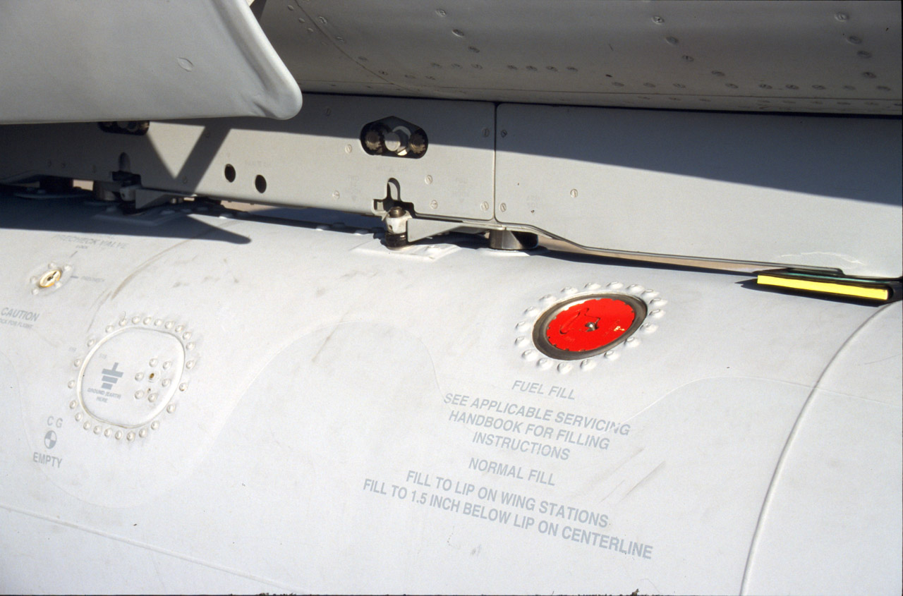 | Détail du logement de train avant et des différentes grilles présentent sous l'intrado du F/A-18 |