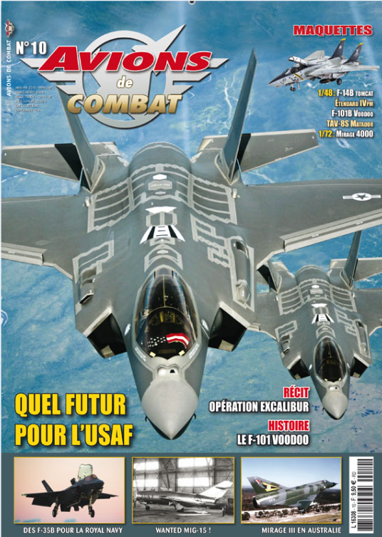 Le nouveau numéro d'Avions de Combat pour les mois de mars à mai nous propose un superbe sommaire avec un article complet sur les F-101 Voodoo, l'opération réussie "Excalibur" des Rafale des FAS, le Mig-15 "déserteur", les Mirage IIIO. Deux articles de fond traitent du futur de l'USAF et des nouveaux porte-avions britanniques avec de bonnes photos.
