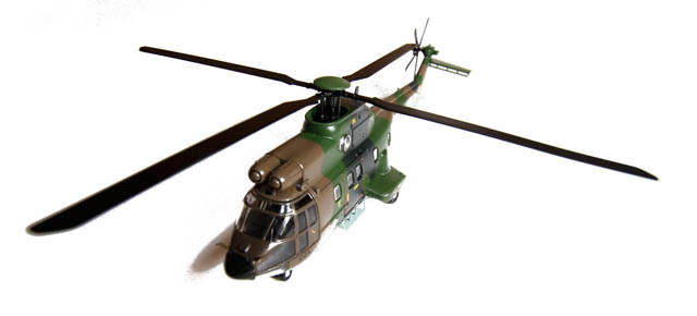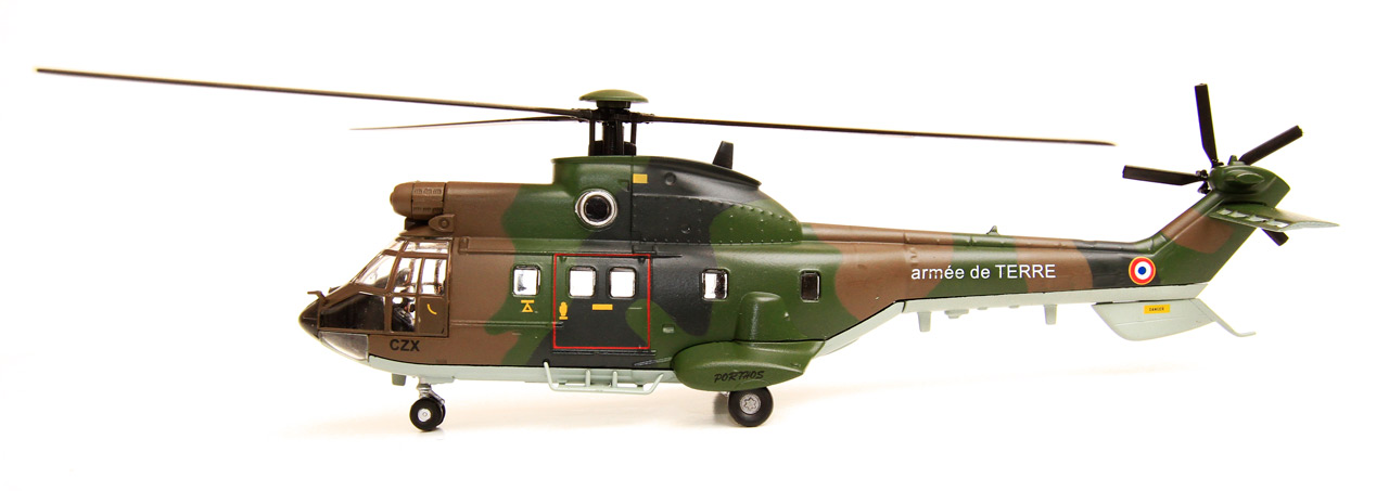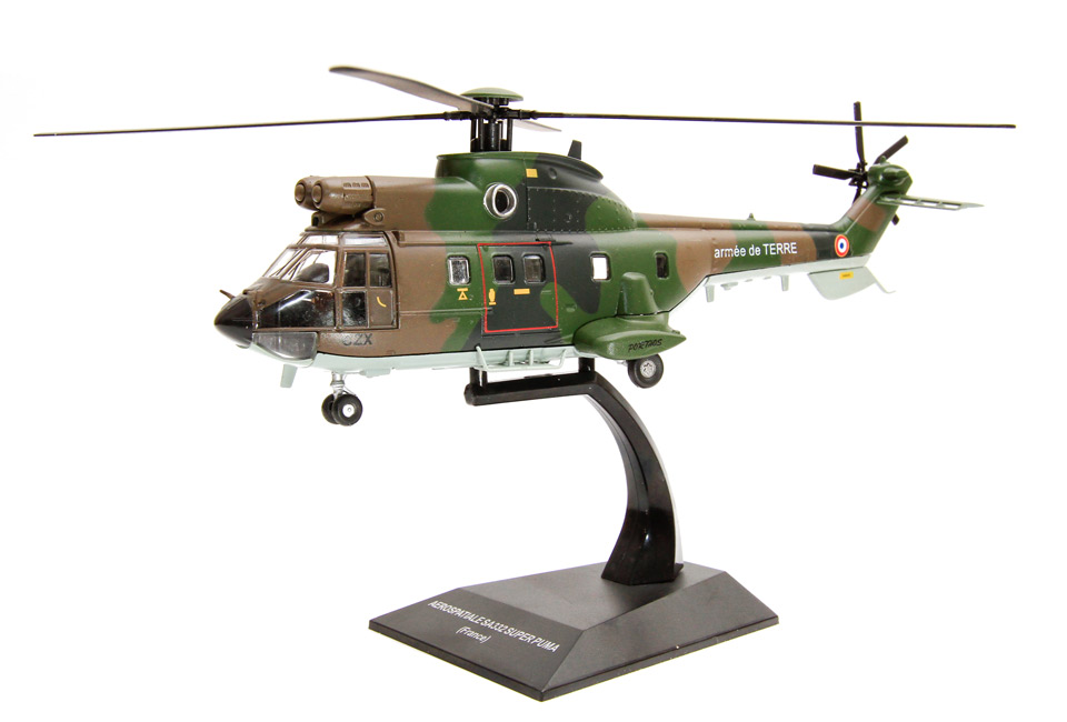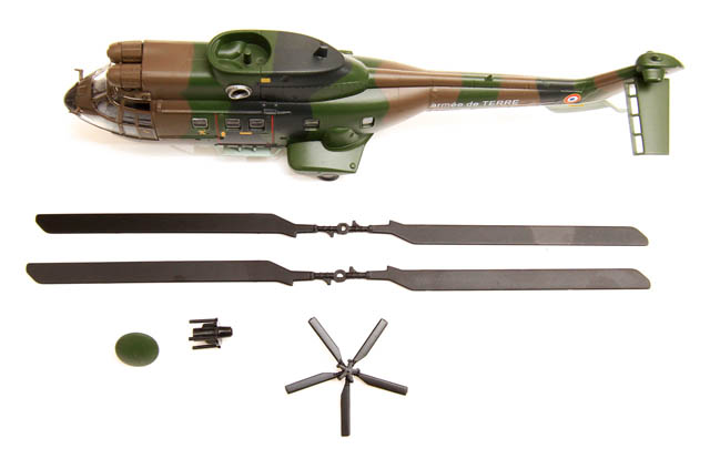 La reproduction de ces modèles en métal à l'echelle le 1/72 est un excellent choix ! Il est juste necessaire de mettre en place les pales et le rotor anti-couple qui sont moulés en plastique. L'opération est simple et ne prend moins de 2 minutes. Pour ce type de reproduction en métal le niveau de détails est assez etonnant, le moulage est relativement fin, les détails tel que les antennes et prise de pression totale sont presentes sur le modèle. J'avoue avoir été agreablement surpris en regardant de plus près dans le cockpit de voir que les manches, palonniers et commande de pas collectif étaient reproduits, et finement moulés. Un pied est fourni et permet de placer l'hélicoptère en hauteur. Page de la collection sur le Site d'Altaya.
