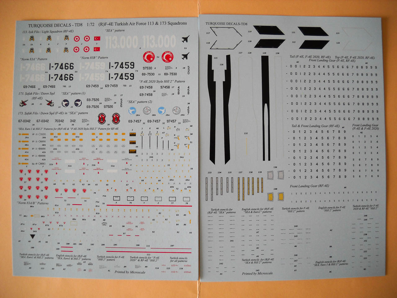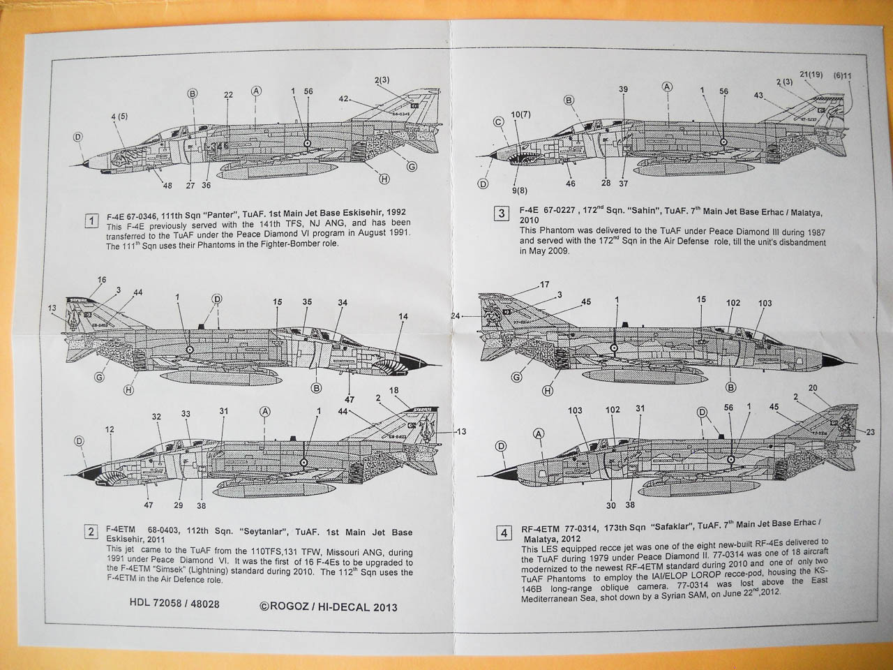 La seconde marque qui nous intéresse ce jour est comme je l’écris plus haut « Turquoise Decals ». Là aussi, coup de cœur garanti !... Les décorations proposées sont certes moins « originales » que celles vu précédemment, mais concernant des livrées classiques, vous avez tout ce qu’il vous faut pour représenter presque n’importe quel Phantom turc, F-4E ou RF-4E , en livrée South East Asia, Hill Grey, mais aussi et surtout Luftwaffe Norm 83 A ou B portées par les RF-4E obtenus de seconde main auprès de l’Allemagne.