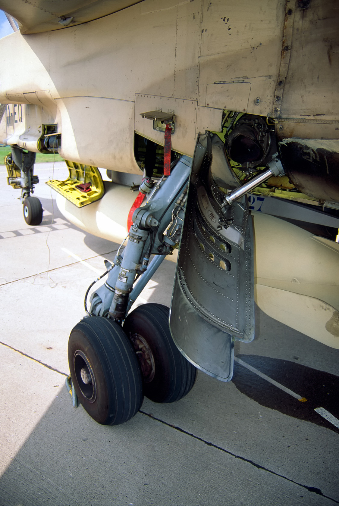 Intrados de l'aile gauche, avec les volets baissés.