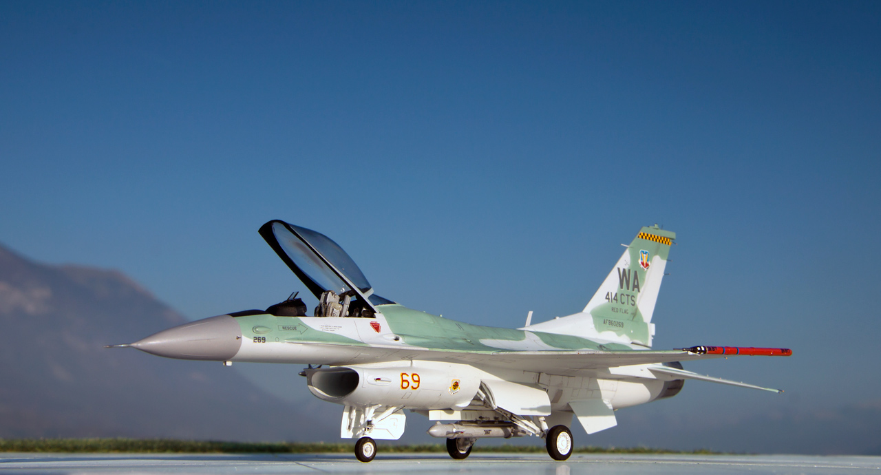 General Dynamics F-16C Viper "AGGRESSOR" 414 CTS NELLIS AFB 1999 Maquette Revell 1/72 Bientôt 10 années que le kit Revell est sorti et je n'avais encore jamais monté ce kit. Le but de ce montage était de comparer ce kit avec les maquettes Academy et Hasegawa. J'ai beaucoup apprécié ce kit, il offre de nombreuses possibilités de versions, le montage est facile les détails et la gravure sont fins et précis. Le point négatif étant l'entrée d'air qui demande un peu de travail. - Peinture Gunze et Tamiya, vernis mat Pebeo