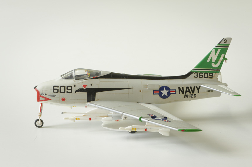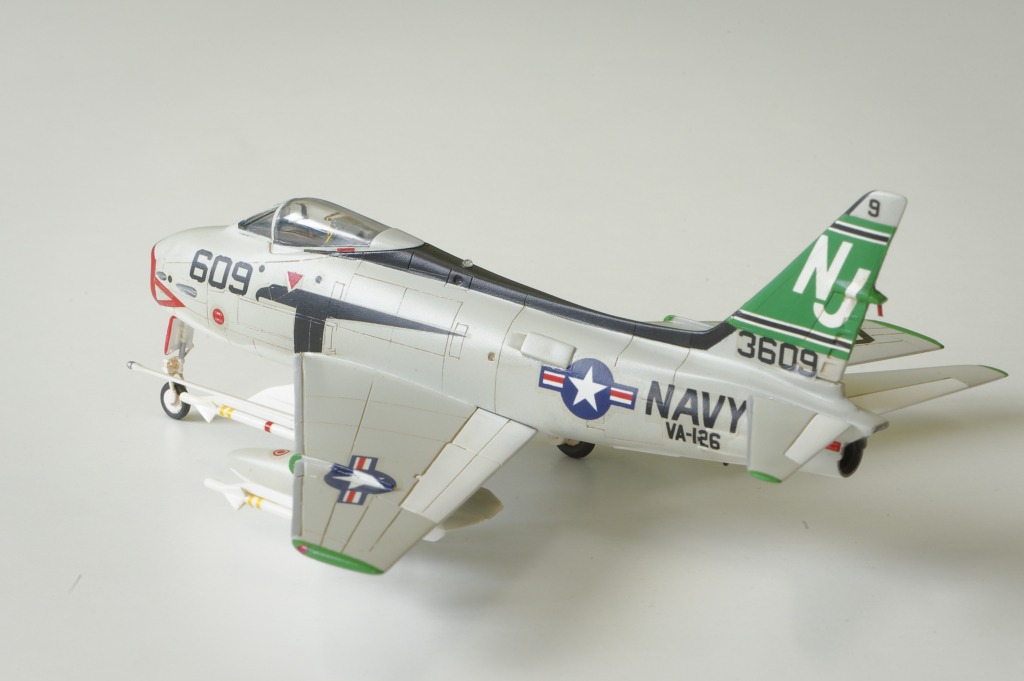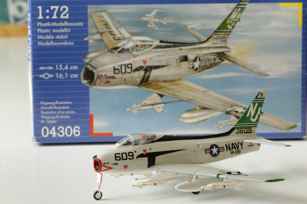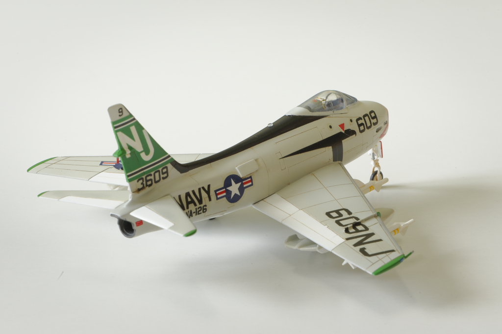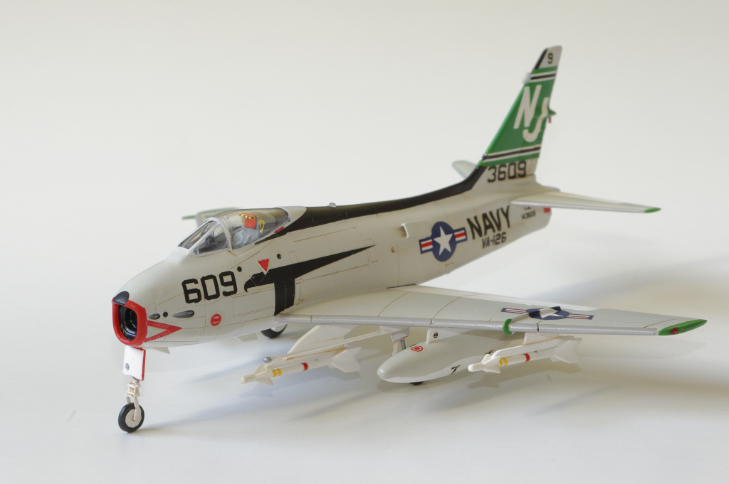 Conclusion : Une maquette à ne surtout pas offrir à un débutant vu la difficulté du montage. Le train d'atterrissage au final semble bien supporter le poids de la maquette. Il faut prévoir un renforcement systématique des équipements externes (corde métallique) et ne surtout pas oublier un lest à l'avant. Après une période de découragement, je suis quand même satisfait du résultat obtenu. C'est le seul FJ-4 disponible aujourd'hui au 1/72ème et je trouve qu'il a fière allure en attendant une maquette plus moderne.