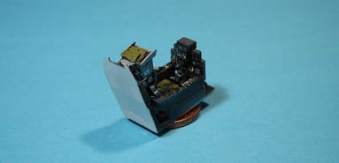 | Le tableau de bord est conservé, le manche est issu de la boîte à rabiot. Passage du noir mat Tamiya suivi d'un gris, à l'aérographe, à main levée. Léger effort de remplissage des parois latérales. Des chutes de decalcs diverses et variées viennent figurer instruments et stencils. |