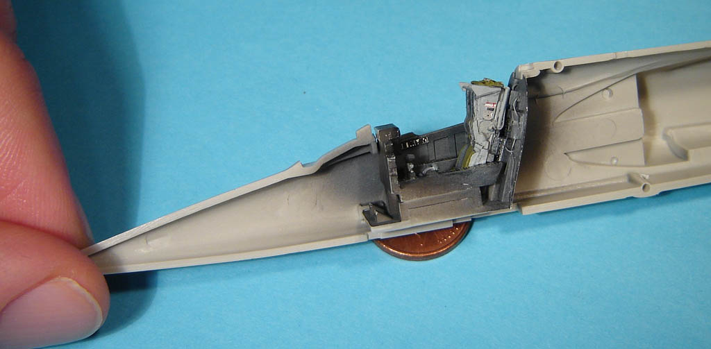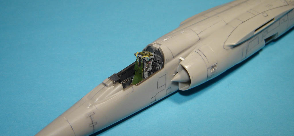 Les aérofreins Hasegawa sont substitués par ceux de la maquette Heller car le nombre de trous est exact. Les prises d'air / écopes près de la tuyère sont refaites car celles d'origine sont beaucoup trop larges.