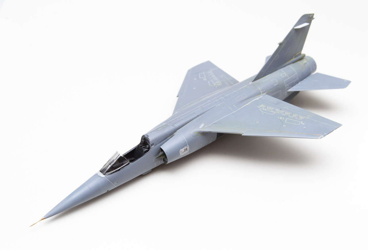 La gravure est un peu trop marquée à mon goût, le Mirage F-1 est dans la réalité un avion très fin et cette gravure proposée par Special Hobby n'est pas en adéquation avec une reproduction fine de l'appareil au 1/72. Ce défaut est facilement corrigeable. J'ai appliqué simplement au pinceau sur toutes les lignes de structure du Mr Surfacer 500. Puis l’excédent a été poncé au papier à l'eau grain 800.