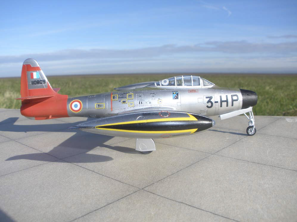 Souhaitant réaliser un F-84G de la Patrouille de France 1953, j’ai jeté mon dévolu sur le 3-HP (110809) qu’on voit en position de leader sur la seule photo que je connaissais de la patrouille en vol. Après avoir soigneusement passé la maquette au Micromesh, j’ai passé l’apprêt gris Alclad. Après une nouvelle passe de Micromesh, j’ai passé de l’Alclad « White aluminium ». J’ai ensuite passé quelques panneaux à l’Alclad « Aluminium ». J’ai passé de façon plus aléatoire diverses tonalités d’Alclad un peu partout pour éviter tout aspect patchwork. Enfin, j’ai passé du white aluminium aux endroits ou se trouvaient auparavant les cocardes américaines pour suggérer un nettoyage avant pose des cocardes françaises qu’on observe sur la photo.