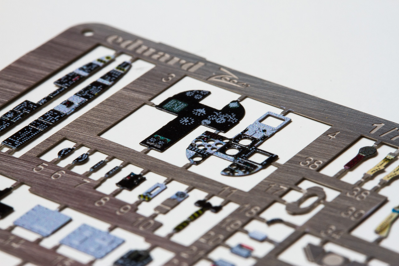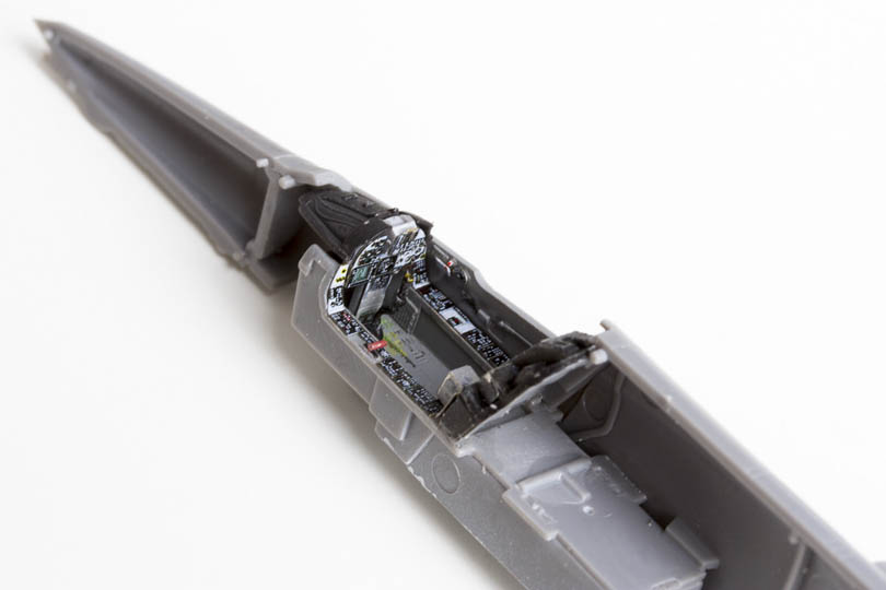 La maquette est correctement détaillée d'origine (cf analyse ici), mais j'ai quand même souhaité ajouter le set de photodécoupe Eduard. A noter que la pièce qui constitue l'arrière du cockpit présente toutes les caractéristiques du cockpit réel. L'ensemble du cockpit est peint avec la teinte MRP 094. Par contre, la partie arrière derrière le siège est peinte en noir matt (MRP-171).