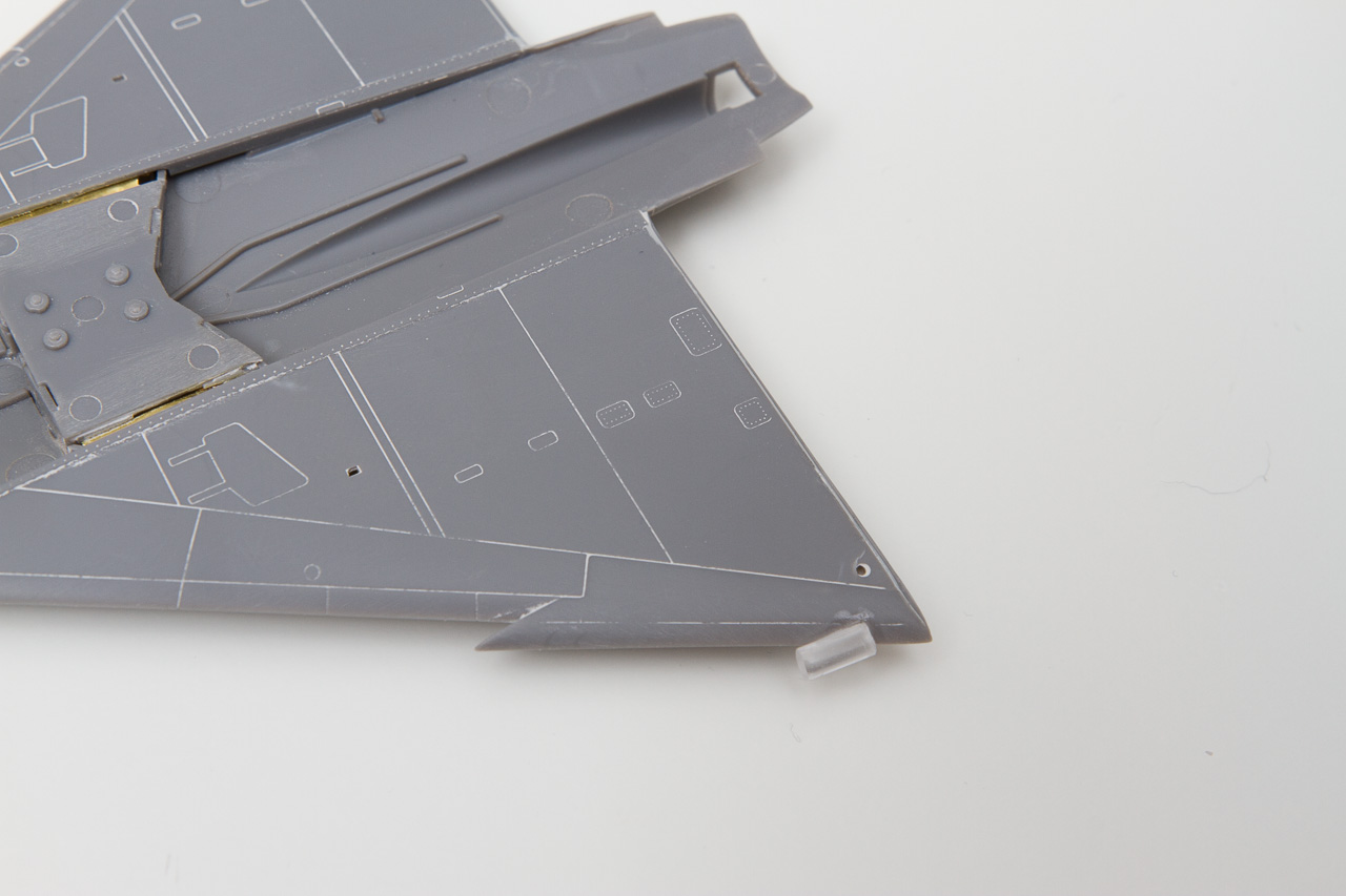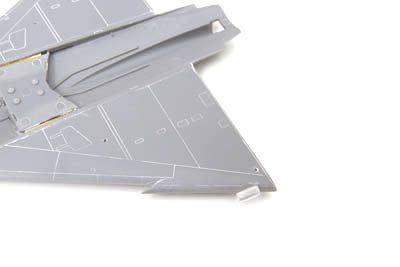 Les élevons ont été découpés pour être replacés ensuite légèrement braqués comme c'est souvent le cas lorsque l'avion est au parking. La découpe est effectuée avec une lame type X-acto n°11 en effectuant plusieurs passages sans trop appuyer pour éviter la formation de bourrelets.
