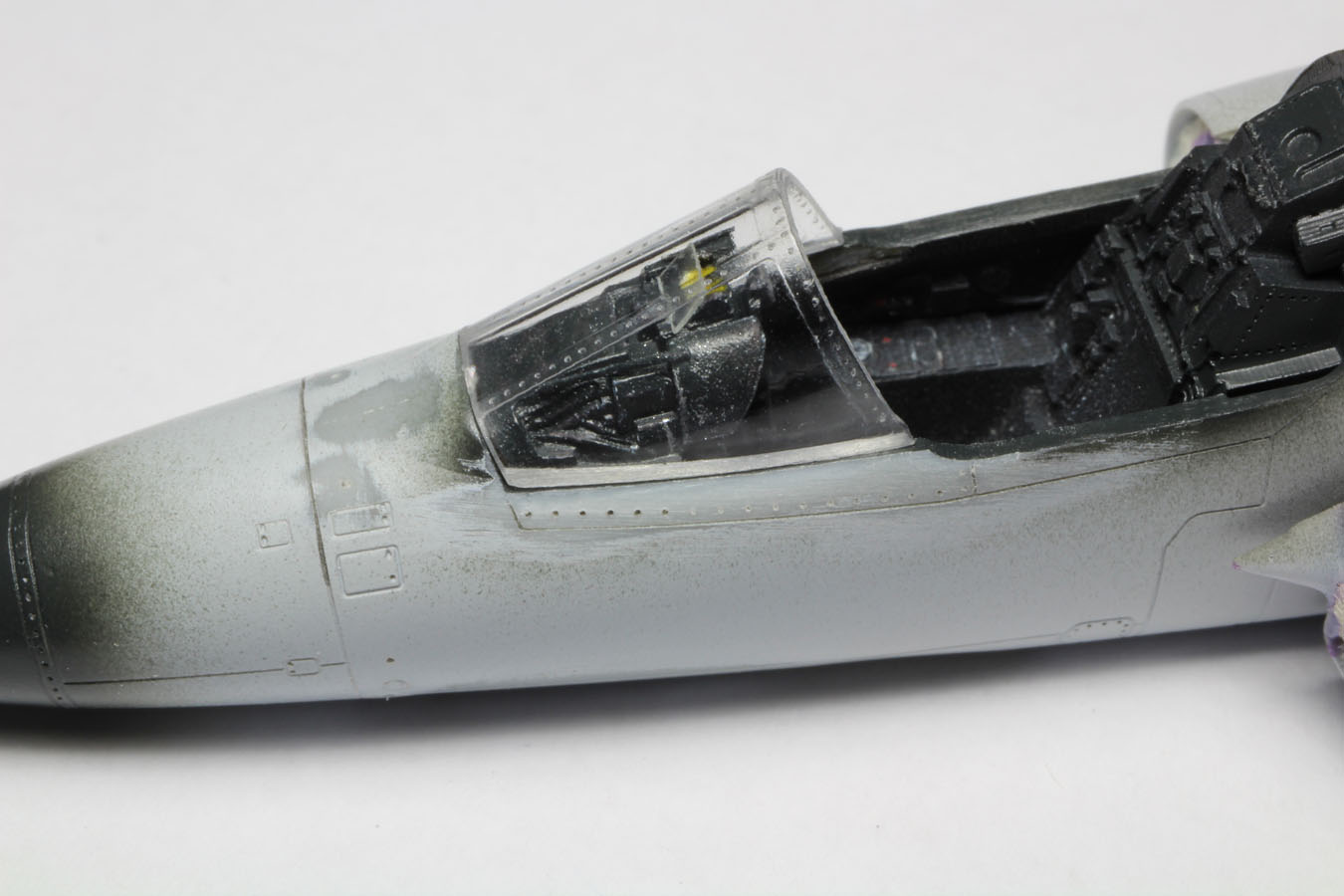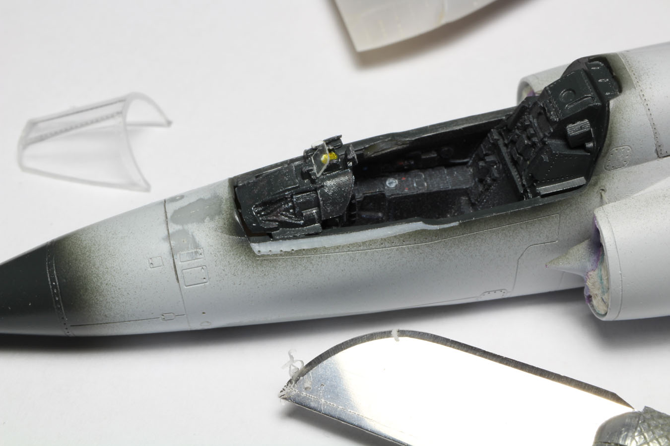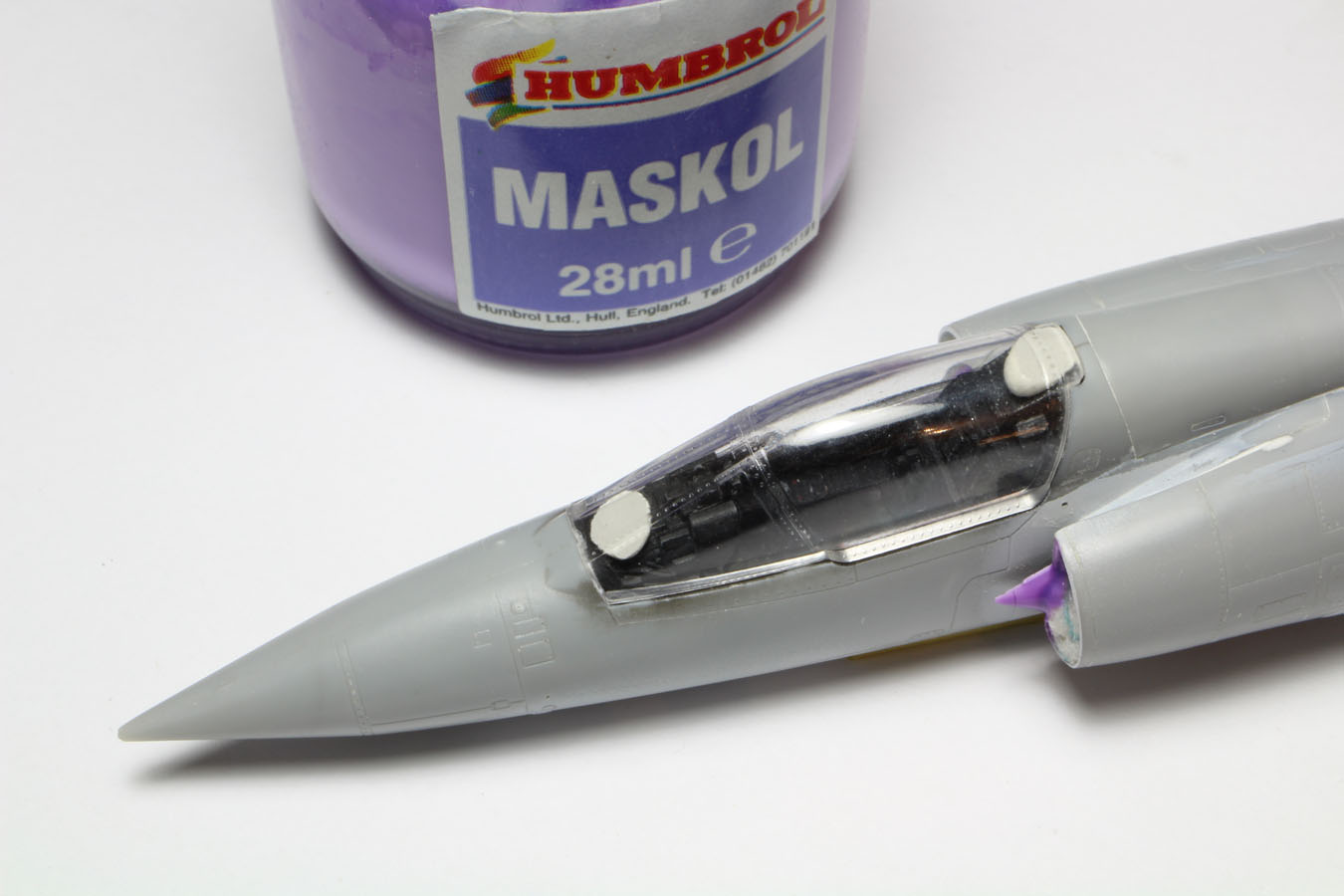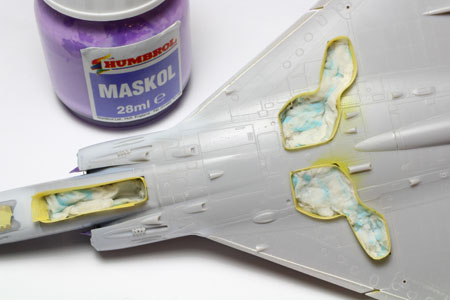 | Un peu de maskol vient protéger les souris d'entrée d'air déjà peintes. La verrière fournie en une seule pièce servira de 'masque' pour la cabine. |