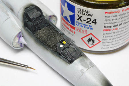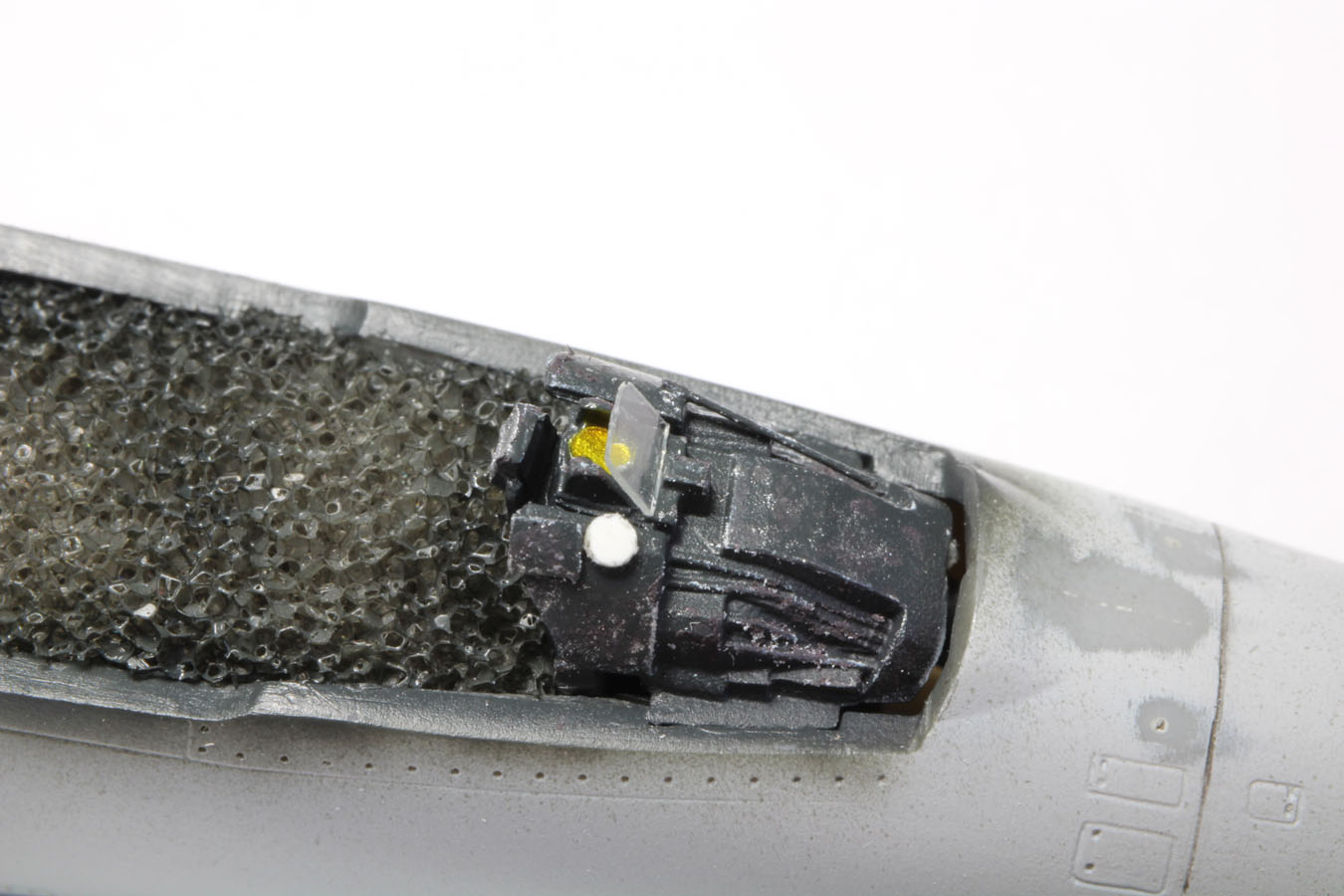 | La casquette du tableau de bord est un élément séparé ce qui est une très bonne chose. Le niveau de détails sur cette pièce est TOP mais pour un appareil argentin il faut rajouter ce cercle de couleur blanche du côté droit. J'ai aussi appliqué du clear yellow dans le cercle du système HUD. |