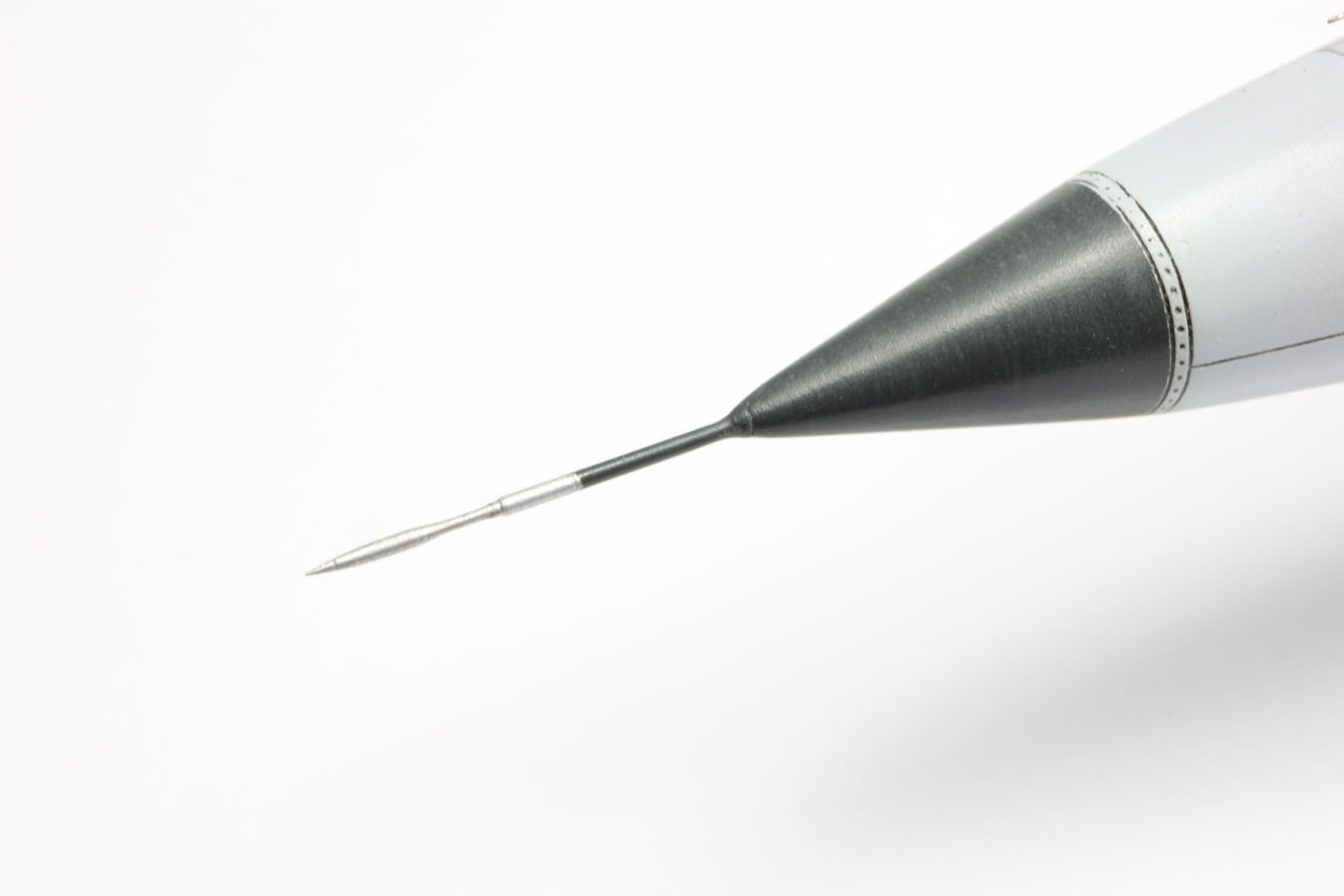 | SONDES ET PITOT Les deux sondes juste devant le pare brise sont prévues dans la boite en photo découpe leur aspect plat ne ma pas convincu. J'ai utilisé des sections d'aiguilles d'accunpucture pliées à 90 dégres pour les remplacer. Deux petits trous aux bons emplacements m'ont permis de réaliser correctement leurs mise en place à la colle blanche. La sonde à gauche placée à l'horizontale a était faite avec une section d'aiguille d'accunpucture. |
