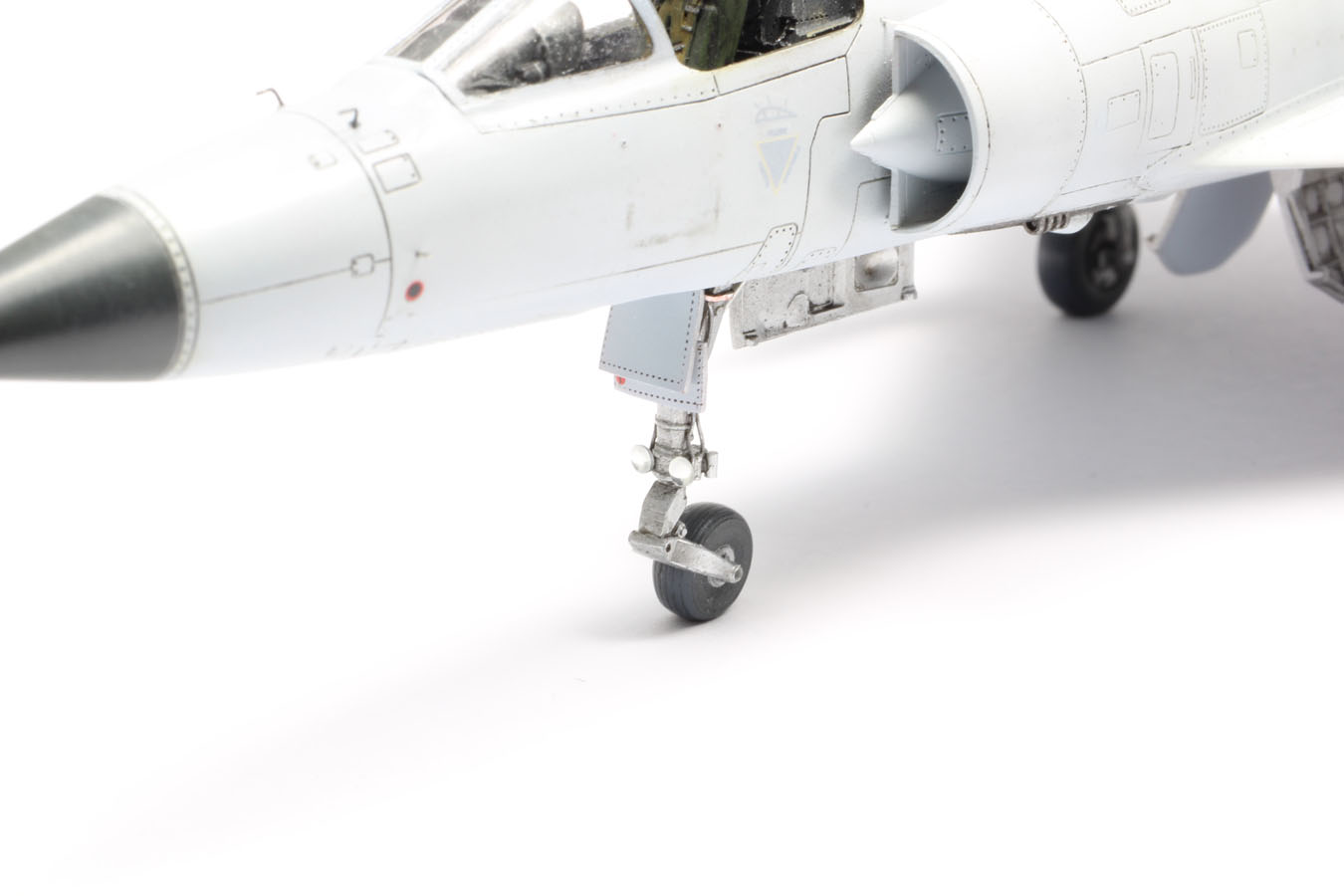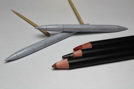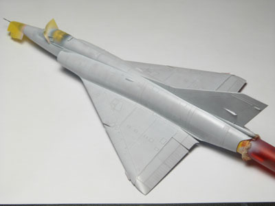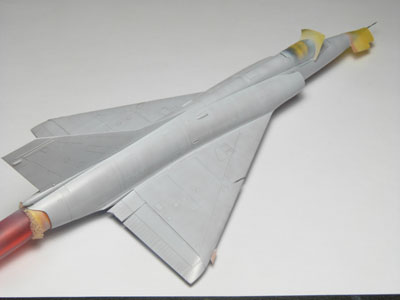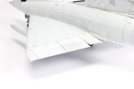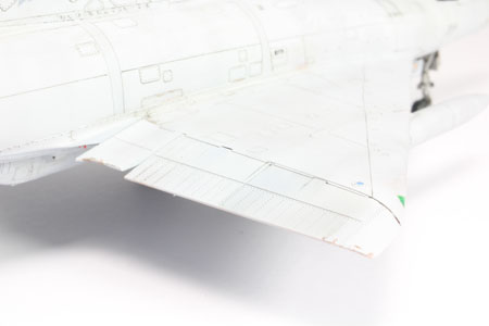 | CHARGES Les seules charges que je vais installer sur ce Mirage seront les deux bidons supersoniques. Quelques traces sont faites aux crayons de couleurs. Quelques saissures sont déposées sur les trappes avec des jus Vallejo. |