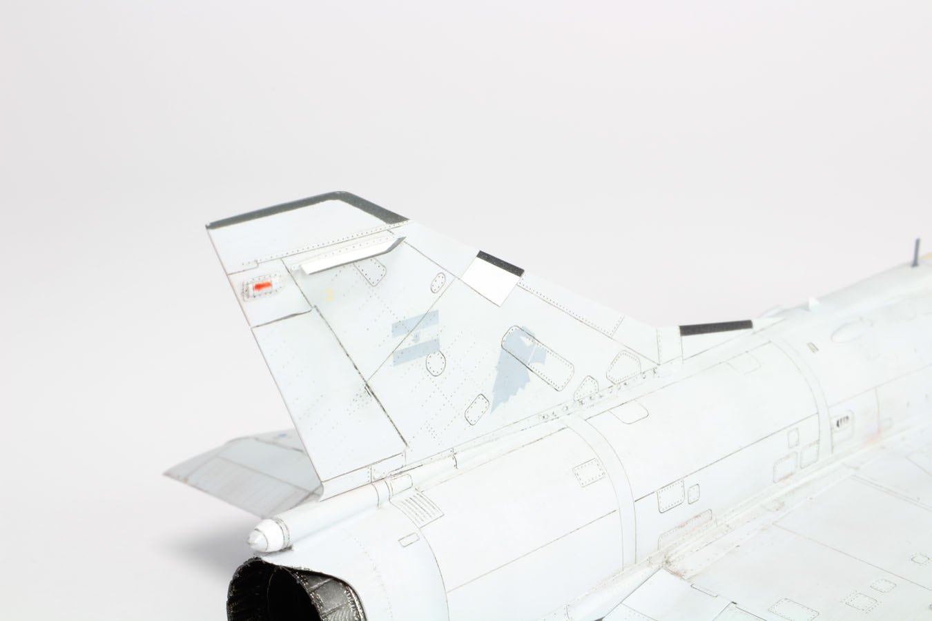| La dérive mérite un peu d'attention, avec ces antennes très délicates à placer. Faut aussi élargir un peu les lignes horizontales du gouvernail, en réalité cet espace est bien visible. |