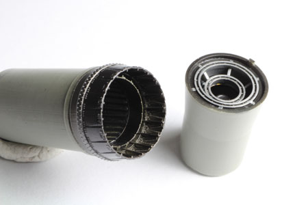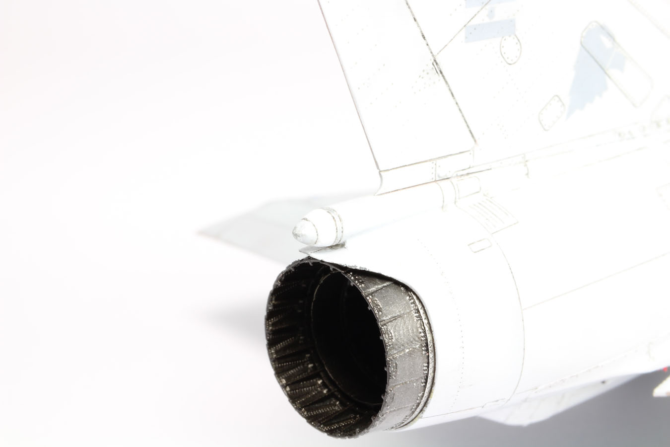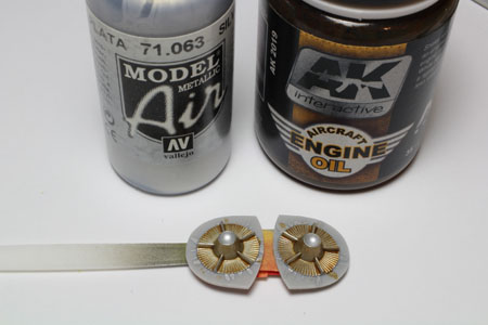 | REACTEUR/TUYERE Le dernier niveau du réacteur est peint au pinceau avec du silver vallejo. Ensuite un jus engine OIL est déposé. |