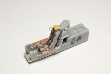 Le siège se glisse facilement dans la baignoire, c'est important de faire cet essai un blanc avant la peinture afin de pouvoir, si nécesseaire, enlever de la matière pour le faire rentrer. Noter que le logement du train avant est déjà prévu et moulé avec les pièces du cockpit. Les ajustements de ce sous ensemble sont très bons.