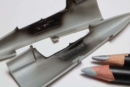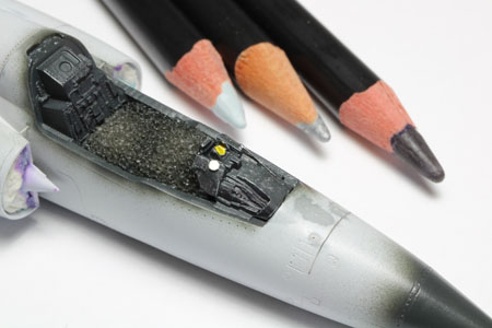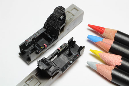| Le cockpit étant noir la peinture reste très simple. Le plus difficile est de mettre en valeur tous ces détails. Pour cela j'utilise des crayons de chez AK mais d'autres crayons de couleur marchent très bien aussi, des fois il est utile de les humidifier. |