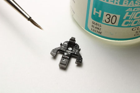 | Le tableau de bord a été traité de la même façon que les autres pièces. Ensuite, après avoir collé les décalques sur la pièce en plastique, les pièces en photo découpe sont placées. Des petites goutes de vernis brillant sont déposées sur chaque instrument pour representer leur vitre. |