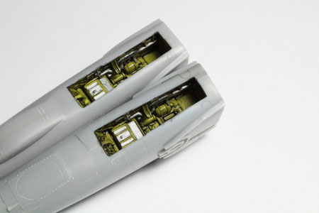 | Le collage de la baignoire dans le demi fuselage gauche est réalisé. Il ne faut pas oublier de rajouter du lest à l'intérieur. Des jus de couleur blanche sont légèrement déposés ègalement par endroit pour mettre en valeur quelques détails. |