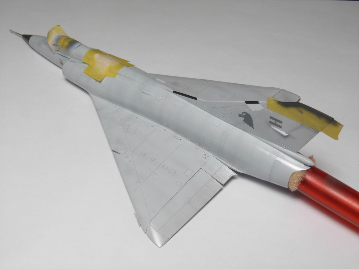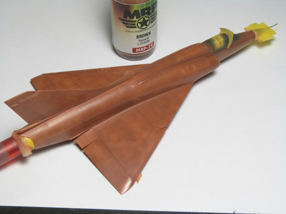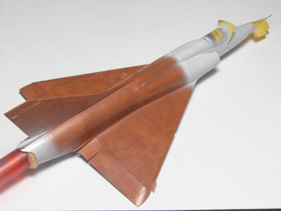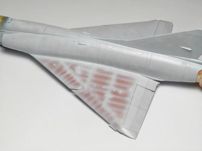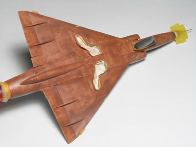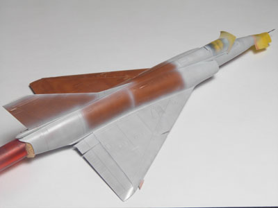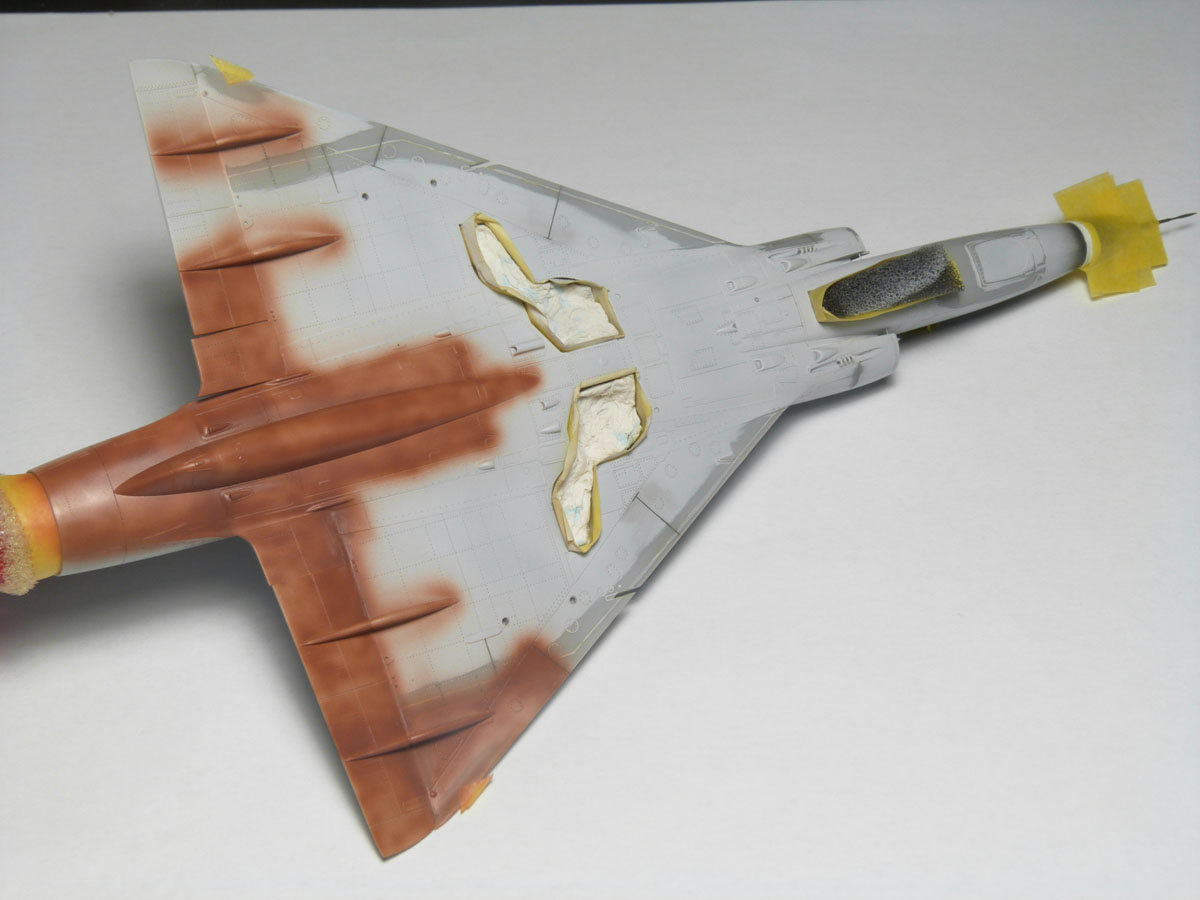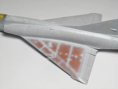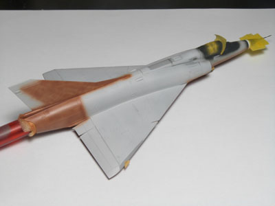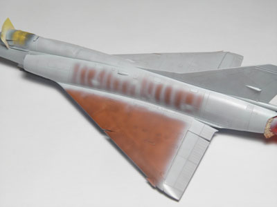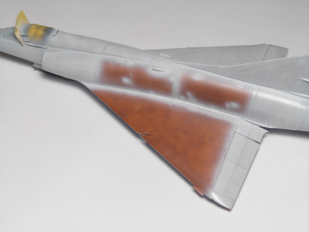 | En analysant des photos j'ai remarqué que sur les vrais machines la couche de base appliqué avant le gris resemblait à du marrom. J'ai décidé de faire pareil sur mon Mirage. Ceci va m"aider à obtenir par transparence la bonne tonalité de gris et de faire apparaître par endroit cette couche protectrice. |