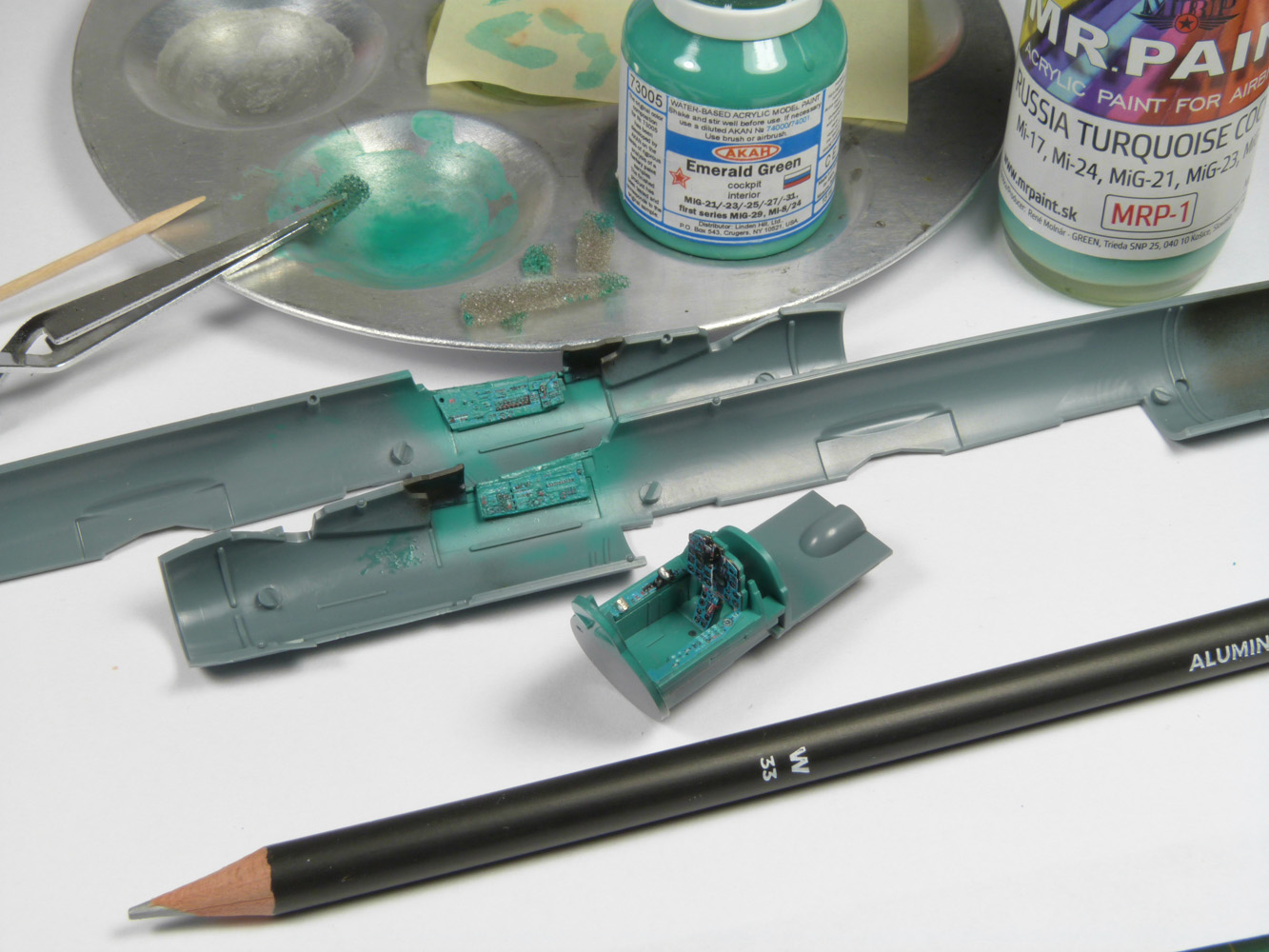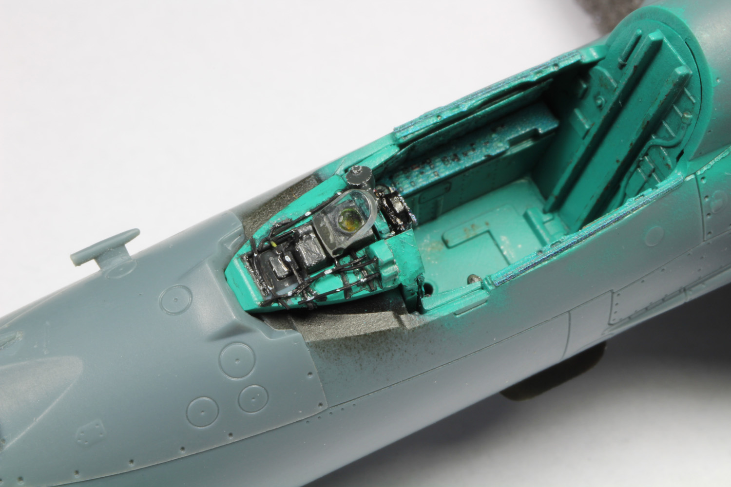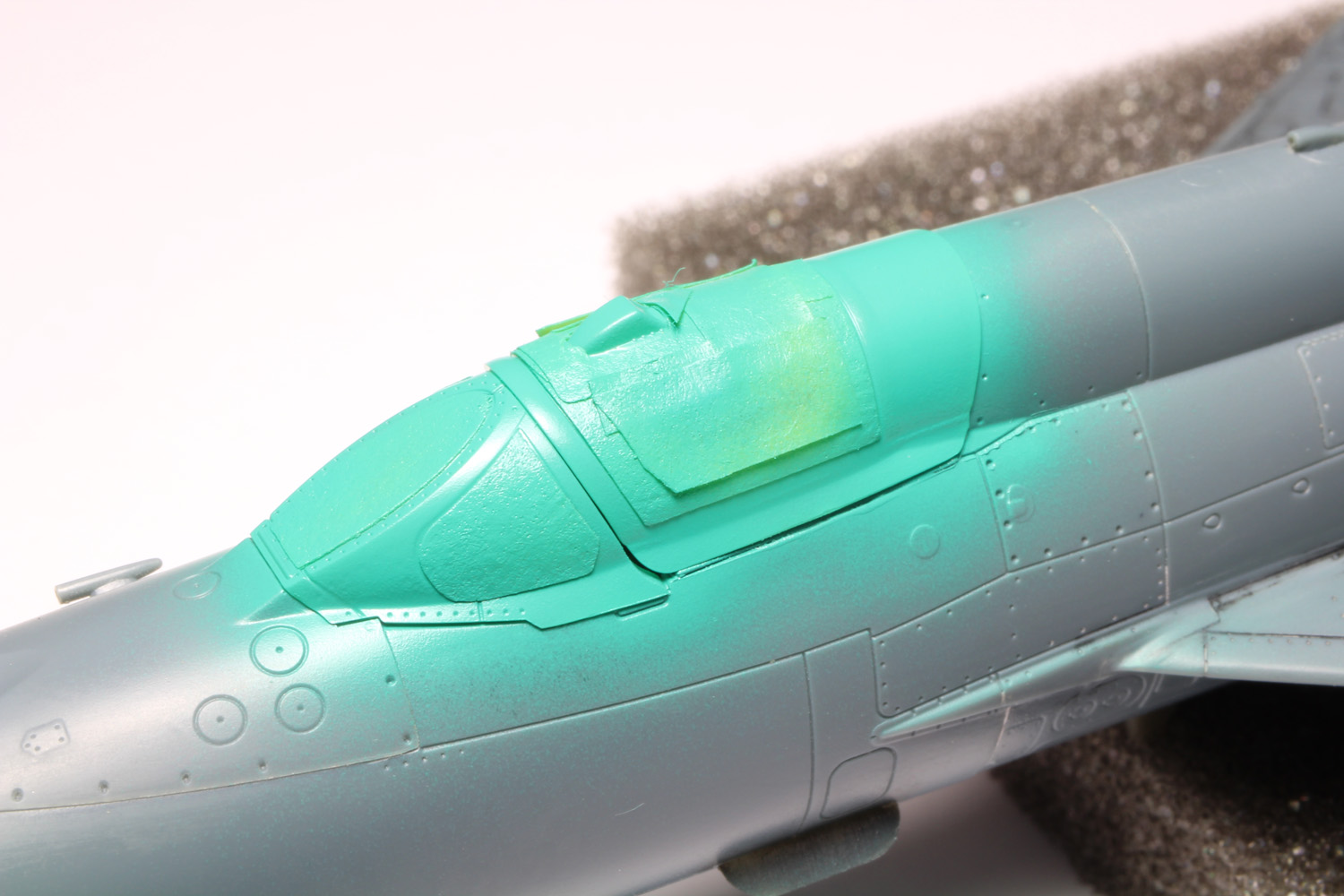 - Sans trop tarder la peinture du cockpit commence avec le vert intérieur russe (MRP-1), ensuite le noir sous la casquette