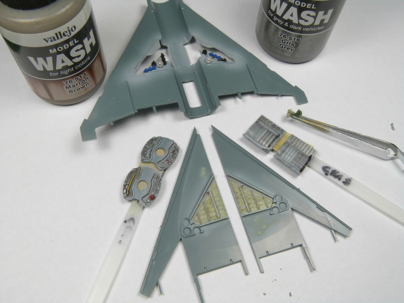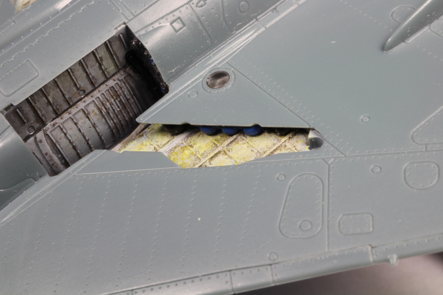 - L'intérieur des ailes sont également peintes avec le même gris. Les pièces E2 et E12 sont peintes au pinceau en bleu et noir