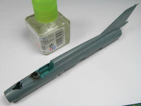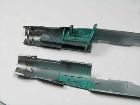 Le cockpit est collé dans le fuselage droit avec l'anneau qui servira à fixer le cône d'entrée d'air.