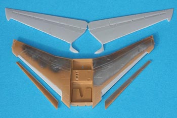 Les ailes sont ensuite assemblées. Les slats sont reconstruits à partir des pièces découpées. Le profil aérodynamique de l’aile est reconstitué en découpant les parties manquantes par découpe dans des ailes de F-14 Italeri inutilisée. Il s’agit d’un plastique tendre très facile à travailler.