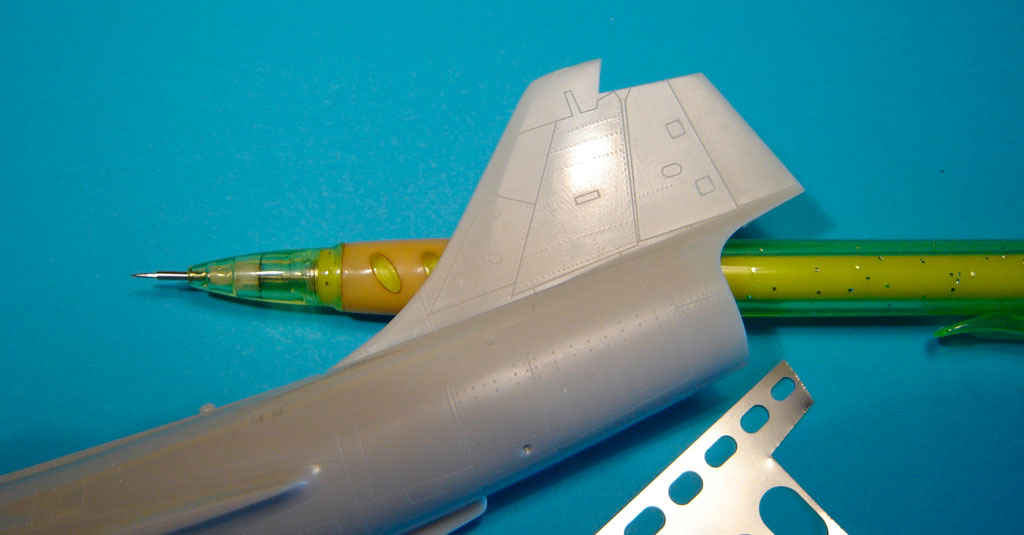 A l'aide d'une aiguille glissée dans un critérium, et d'un set pour regraver d’Hasegawa, le modèle déjà en creux est complété par quelques rivets et lignes de structure.