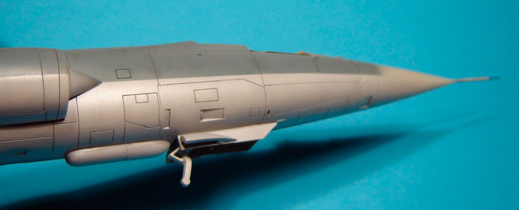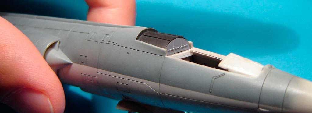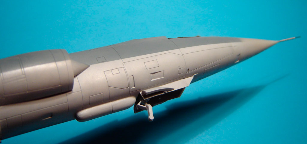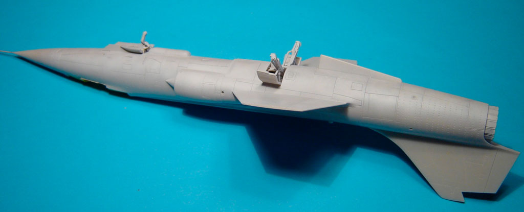 L’assemblage de l’ensemble /fuselage avant, fuselage arrière, entrées d’air/ est assez délicat sur ce kit. Il convient de procéder à des essais à blanc pour éviter une séance dispensable d’application de mastic.