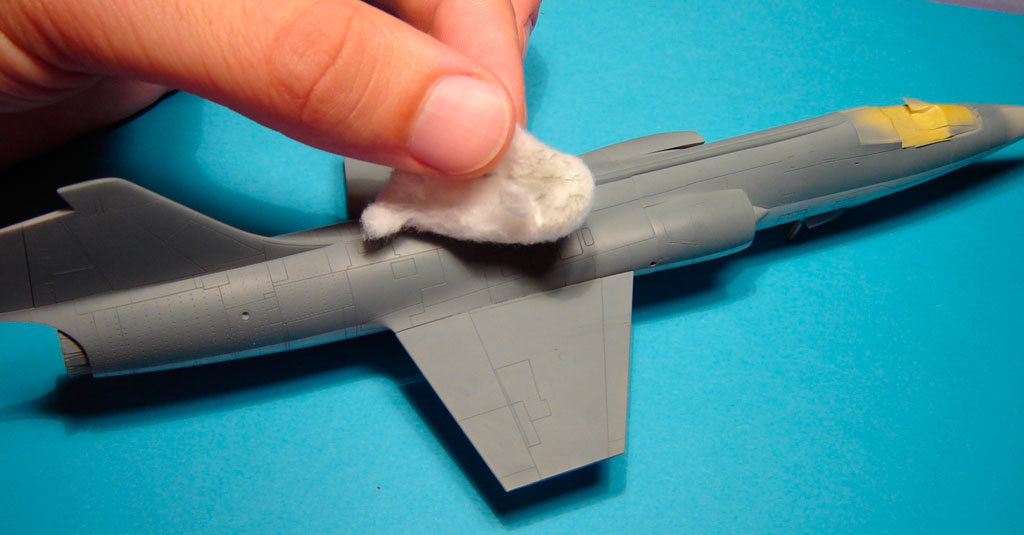 Ce noir matt n’accroche pas trop et permet après lustrage de restituer l’effet métallique de la couche d’alclad.