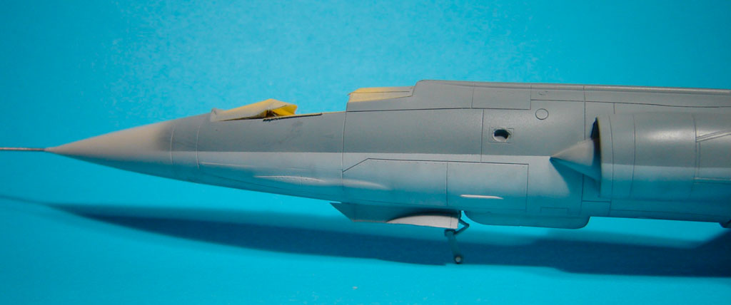 J’ai utilisé une feuille d’Evergreen car les portes de trappes d’Hasegawa sont bien trop épaisses par rapport à la réalité. Il convient d’ajouter pour ce RF-104G le carénage avant de la bosse du système de Reco.