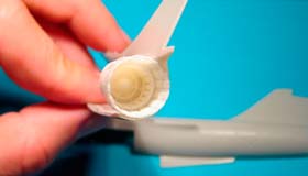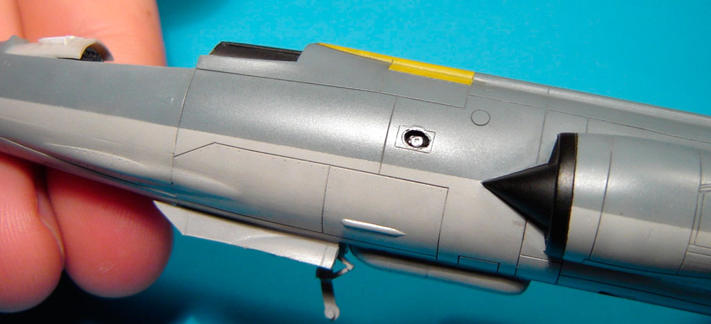 Une chute de grappe transparente figure l’équipement photo KS-87B situé sur le coté du fuselage. La vitre sera représentée avec de la colle blanche Kristal Klir.