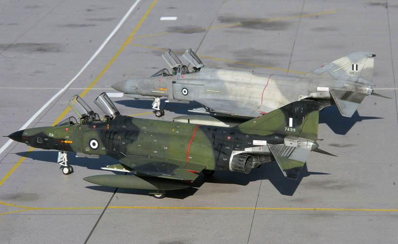Les Grecs utilisent une flotte de reconnaissance composite, équipée de plusieurs versions de RF-4 : des RF-4C, des RF-4E d’origine allemande facilement reconnaissables par leur camouflage vert/vert foncé/noir, et quelques RF-4E tardifs très spécifiques : ce sont les seuls, avec quelques avions opérés par la Turquie équipées d’ailes munies de becs de bord d’attaque (slats) comme les F-4E , F-4F et F-4G. La raison est que la commande étant tardive la ligne de production n’était plus capable de fournir que des avions munis de slats. Ce sont donc les derniers RF-4 construits.
