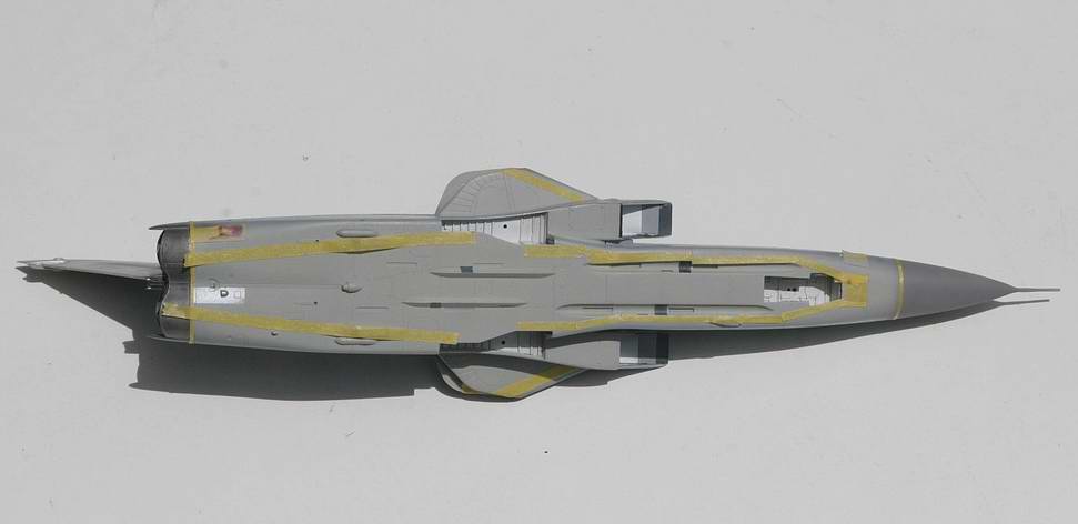 Ces trois sous ensembles sont ensuite assemblés en faisant un petit peut attention aux ajustements. En réalité, contrairement à d’autres maquettes de même conception avant/arrière, ce Tornado F3 Hasegawa, joint très correctement. Des petites touches de mastic et un peu de ponçage sont suffisants pour assurer la continuité des surfaces.